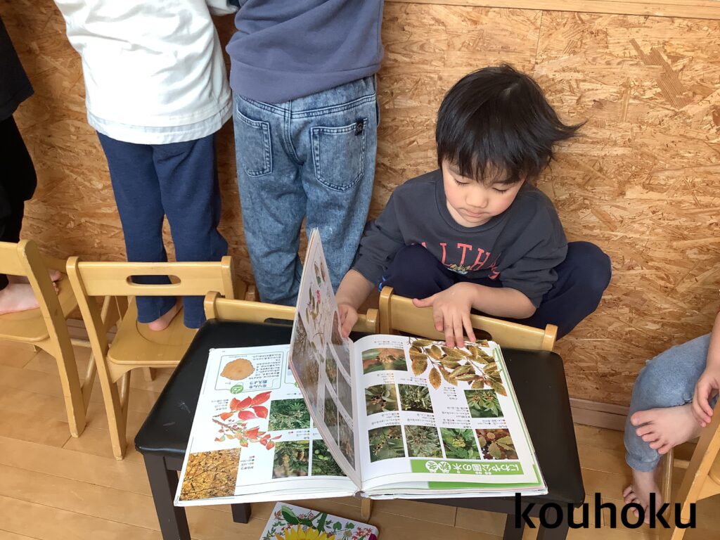 「どんなお花があるかな?」と図鑑を広げ、ひまわりやばら、すみれなどを調べながら