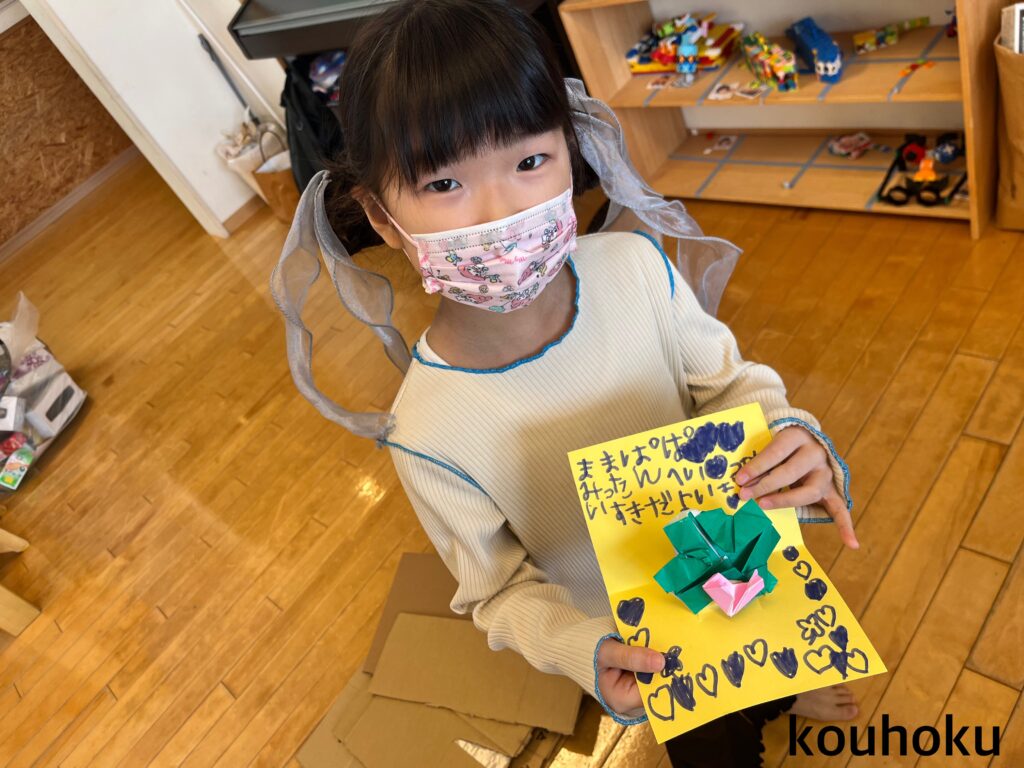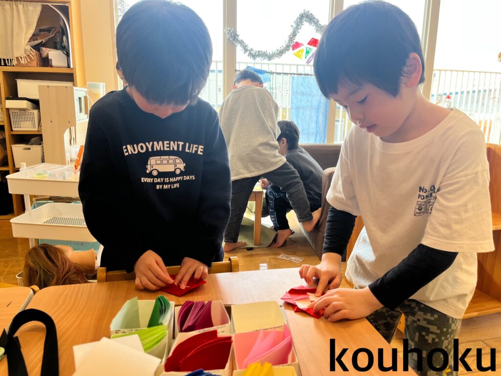 折り紙でお花を折りながら、「こう折るのかな?」「こうだよ!」と友だち同士で教え合い、励まし合う姿が微笑ましく、心の成長も感じられます。一つひとつ「ありがとう」の気持ちを込めて、丁寧に仕上がっています!