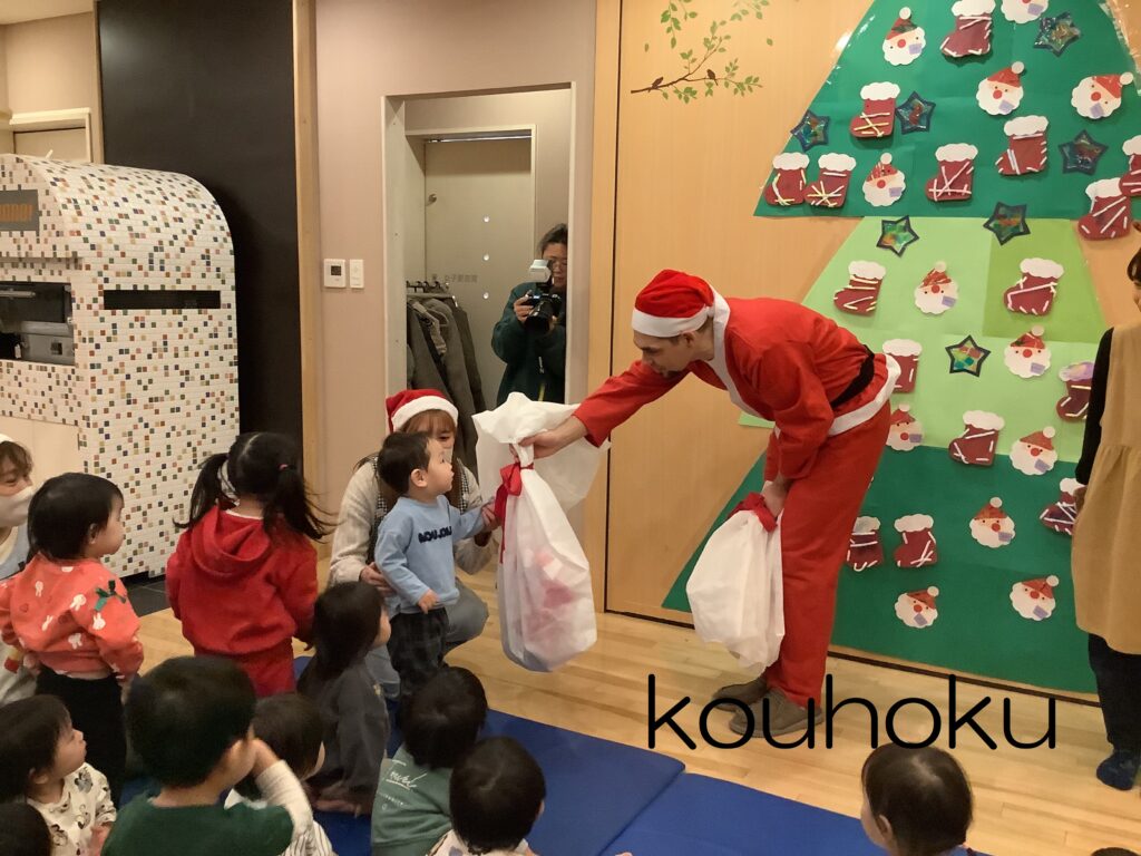 キッチンホールにみんな集まるとリンリンと鈴の音が聞こえてきました。サンタさんが近くにきているのかも!?と「サンタさーん!!!」とみんなで呼んでみると、なんと!元気な声を聞いてサンタクロースが会いに来てくれました。