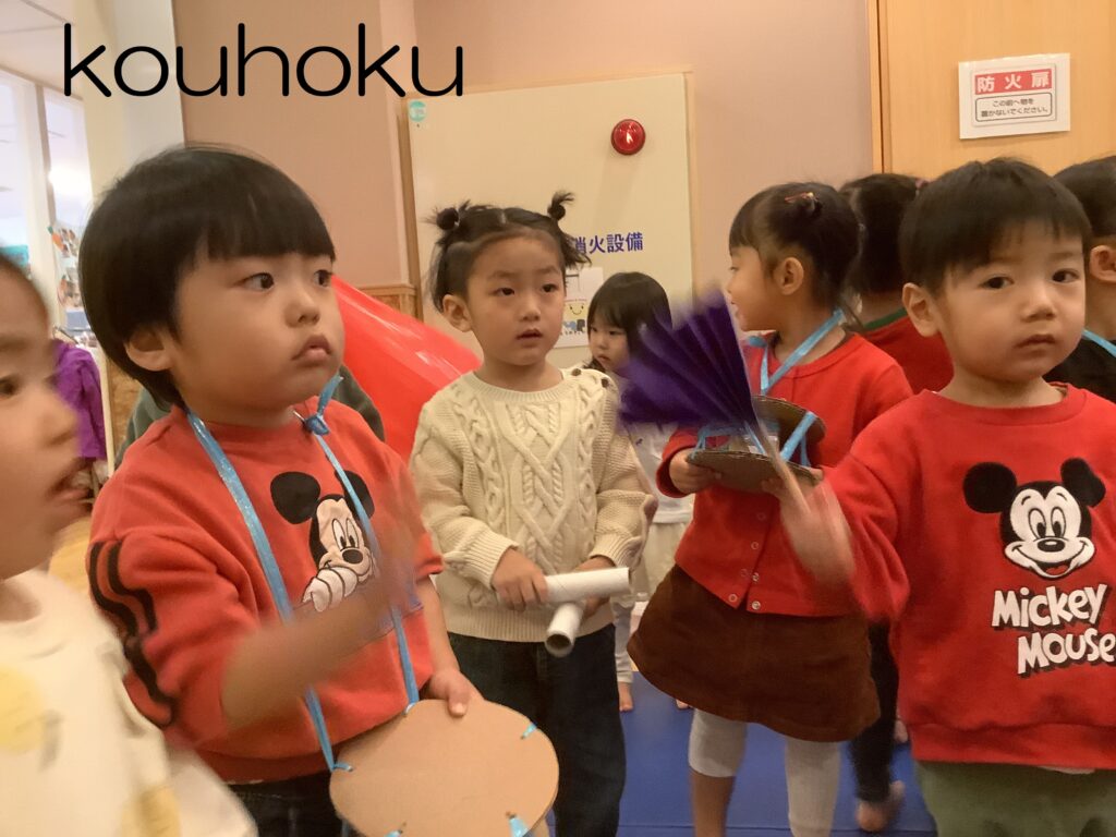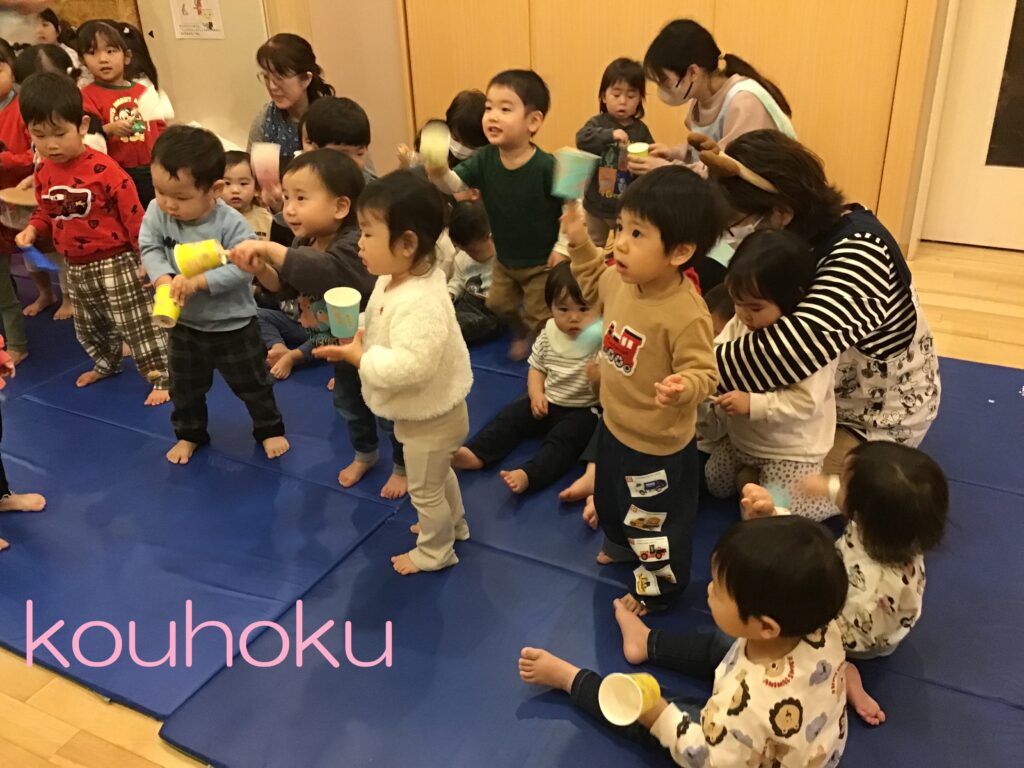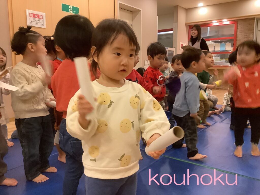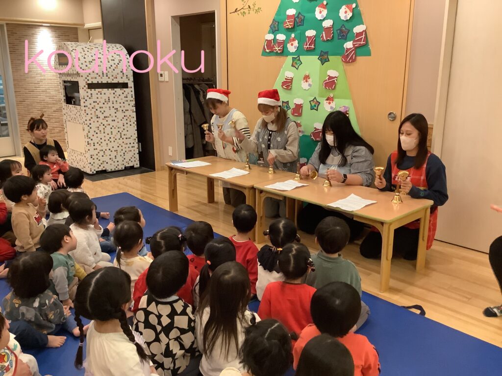 保育士のハンドベルを聞いてみんなも楽器演奏をしたい!!とのことで、最後に『あわてんぼうのサンタクロース』の音楽に合わせて楽器演奏を楽しみました♩