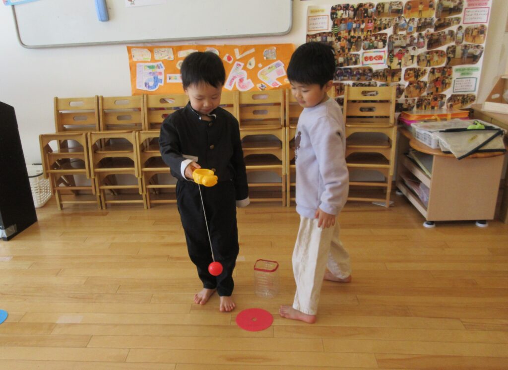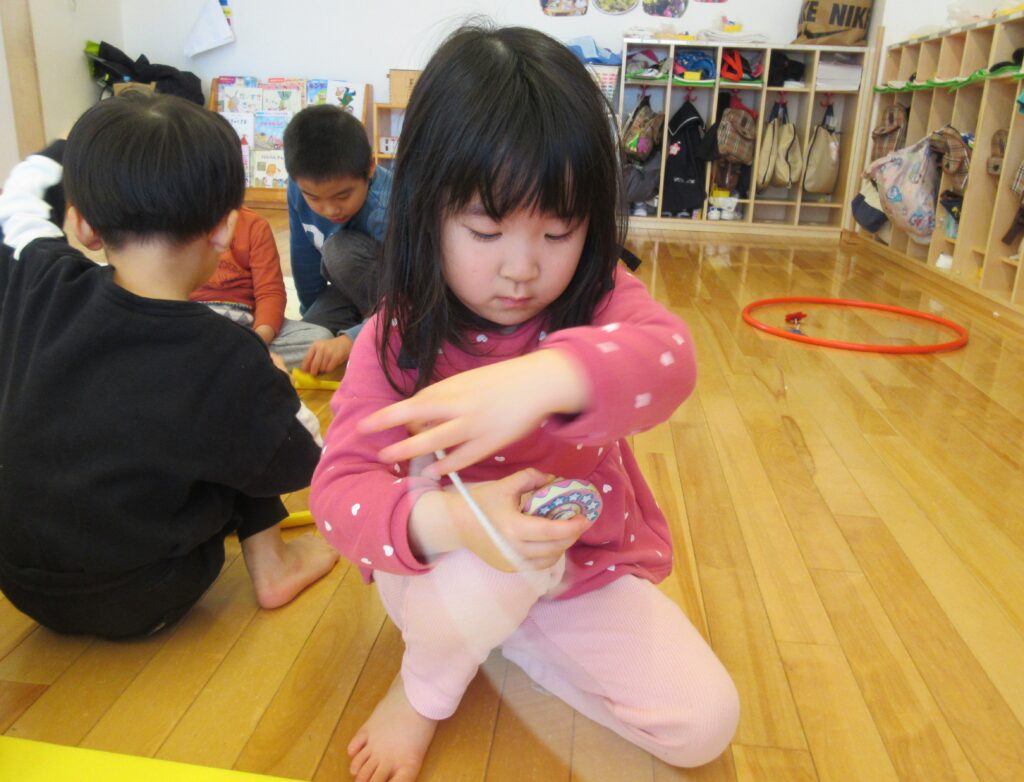 紐こまでは、こまに紐を巻きつける方法を覚えながら