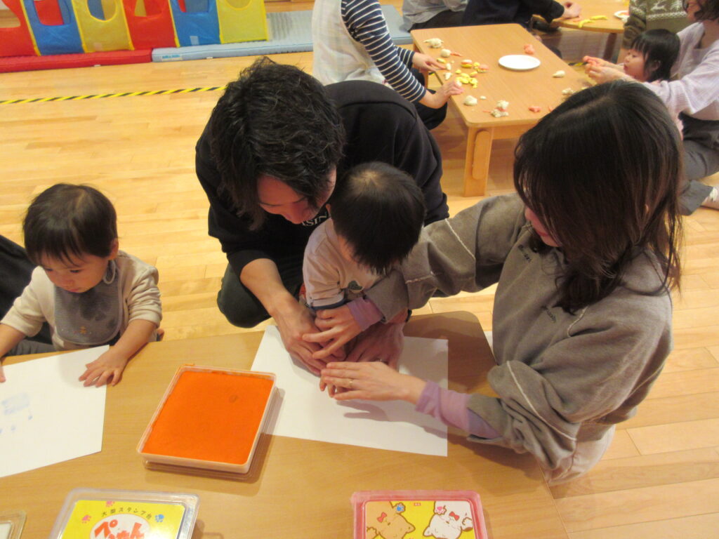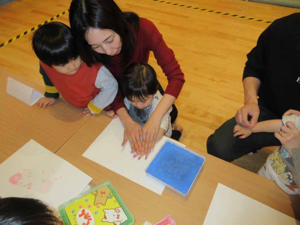 親子で一緒にぎゅっぎゅとインクを付けて、手形を取りました。