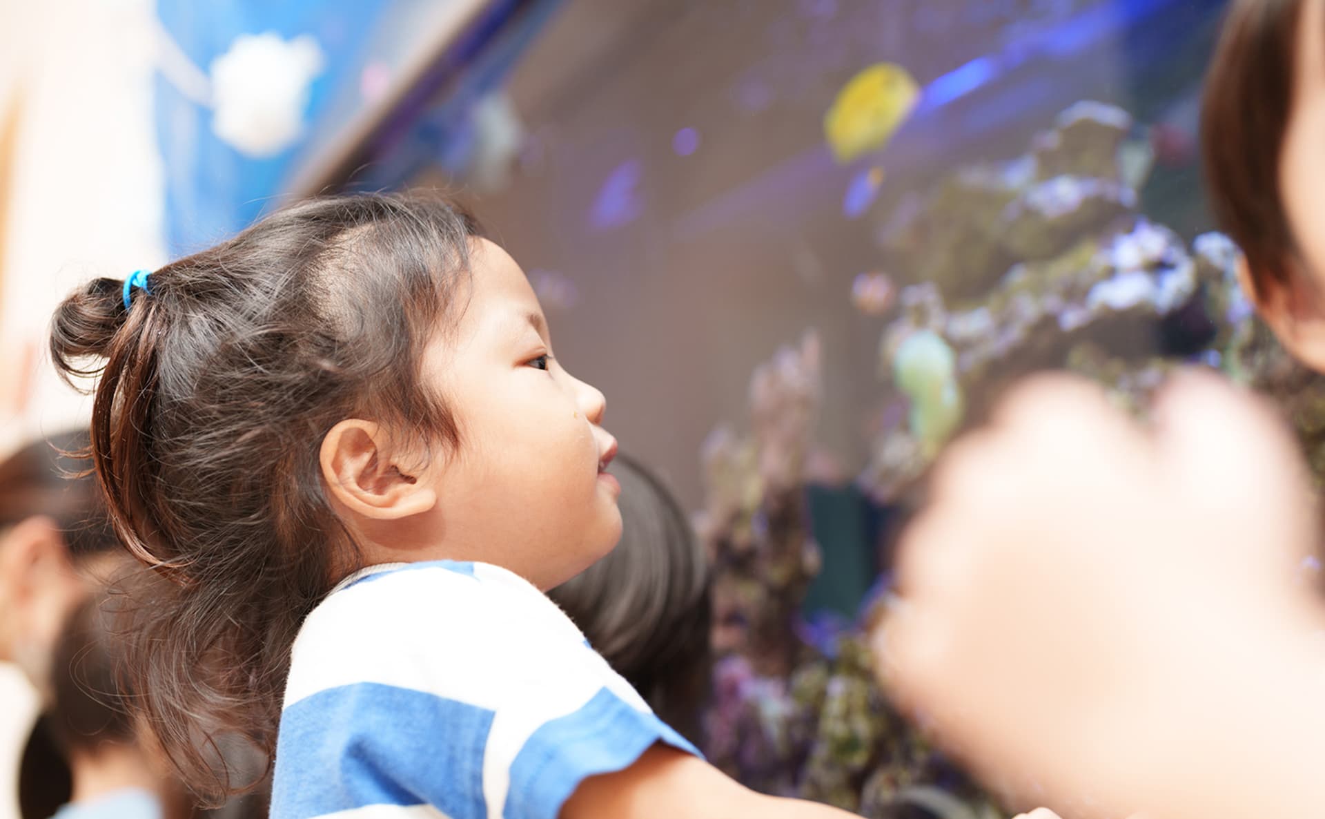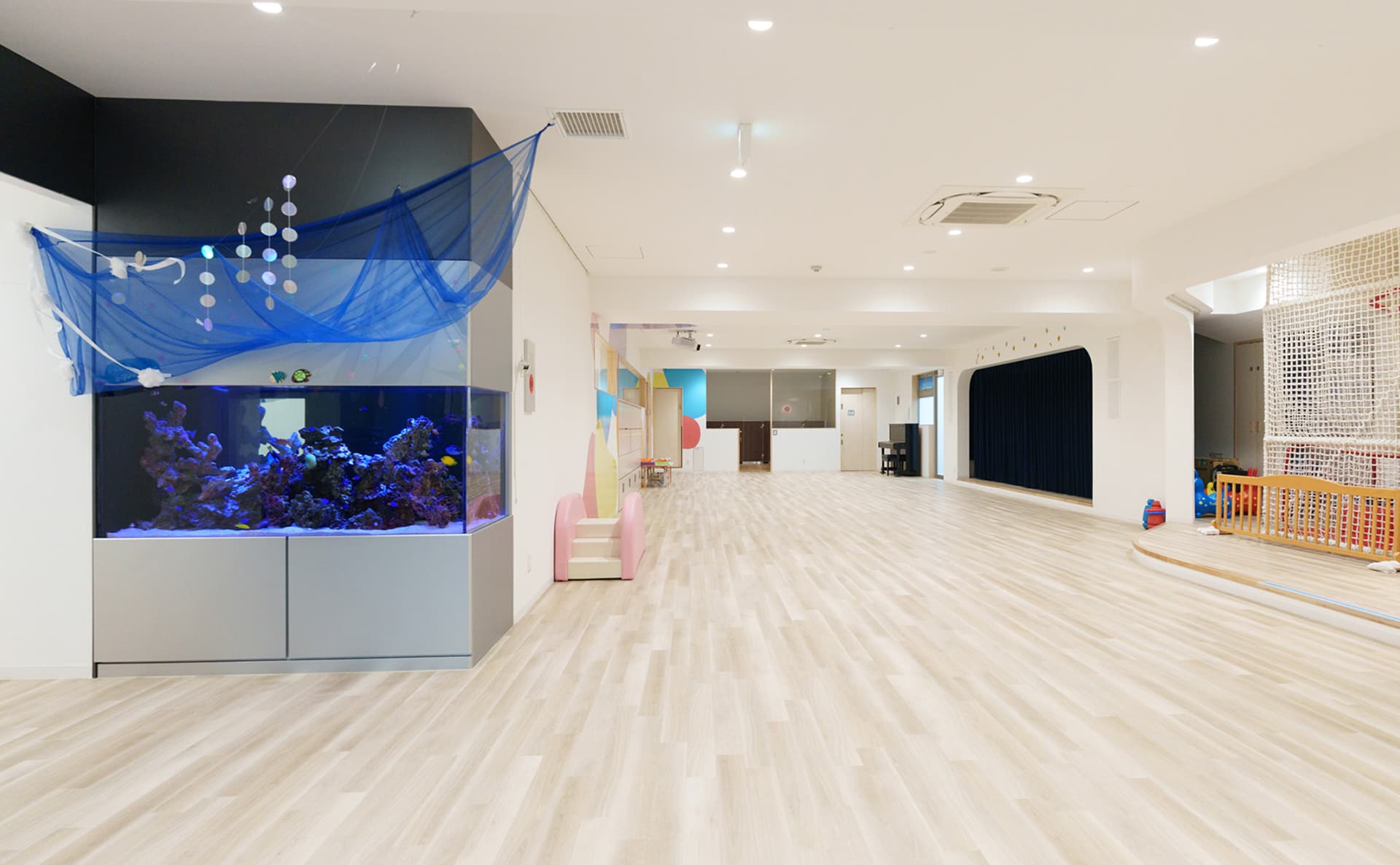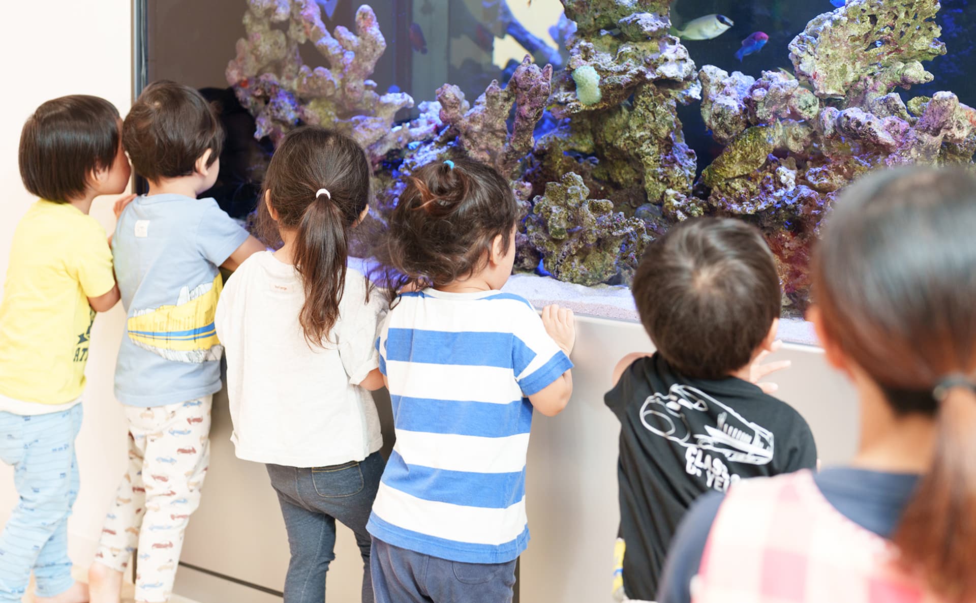 水槽にはカラフルな熱帯魚が泳ぎ、登降園の際には子どもたちが見て「おさかなキレイ」「えびさんいないね?」などと楽しそうに話してくれます。