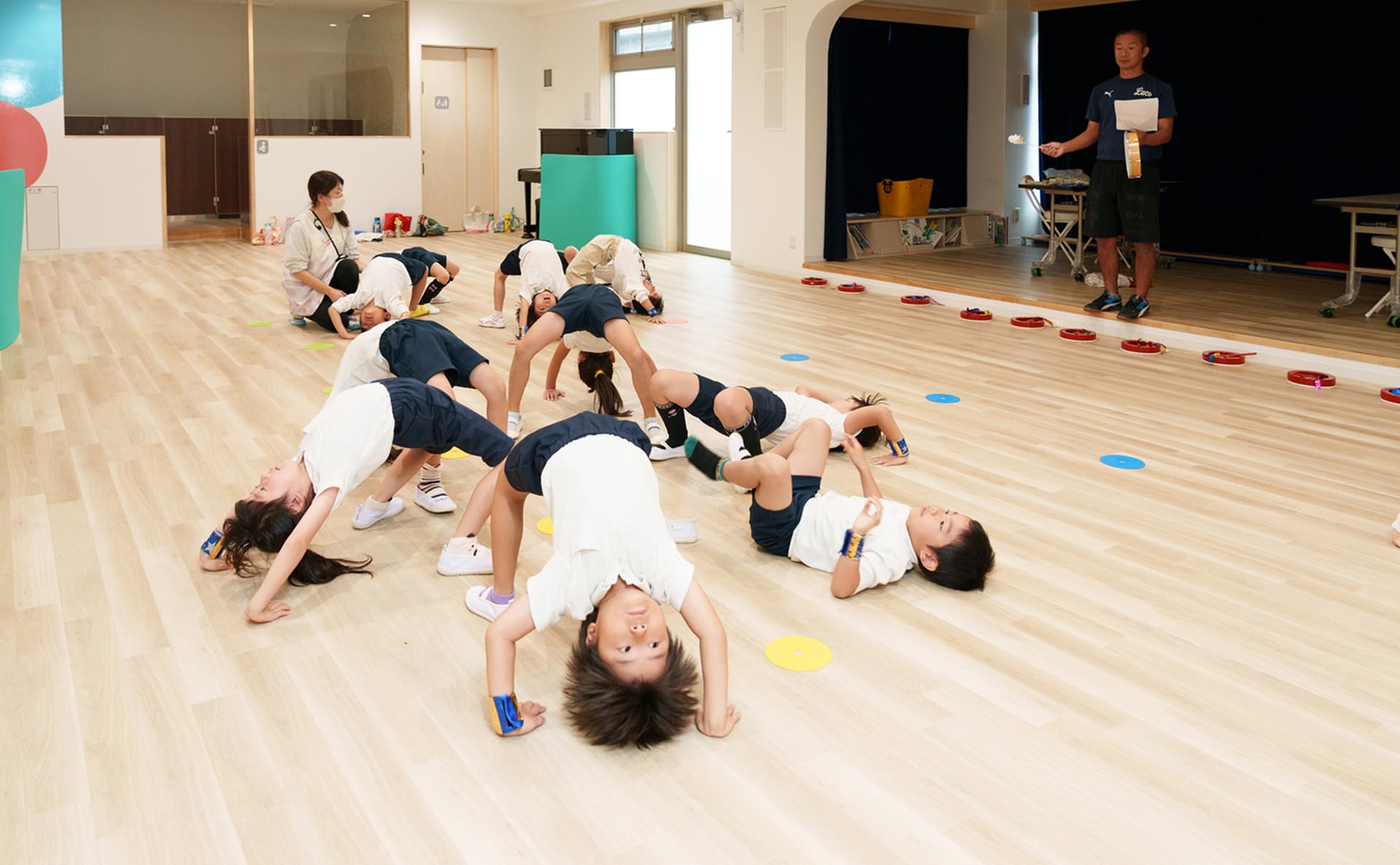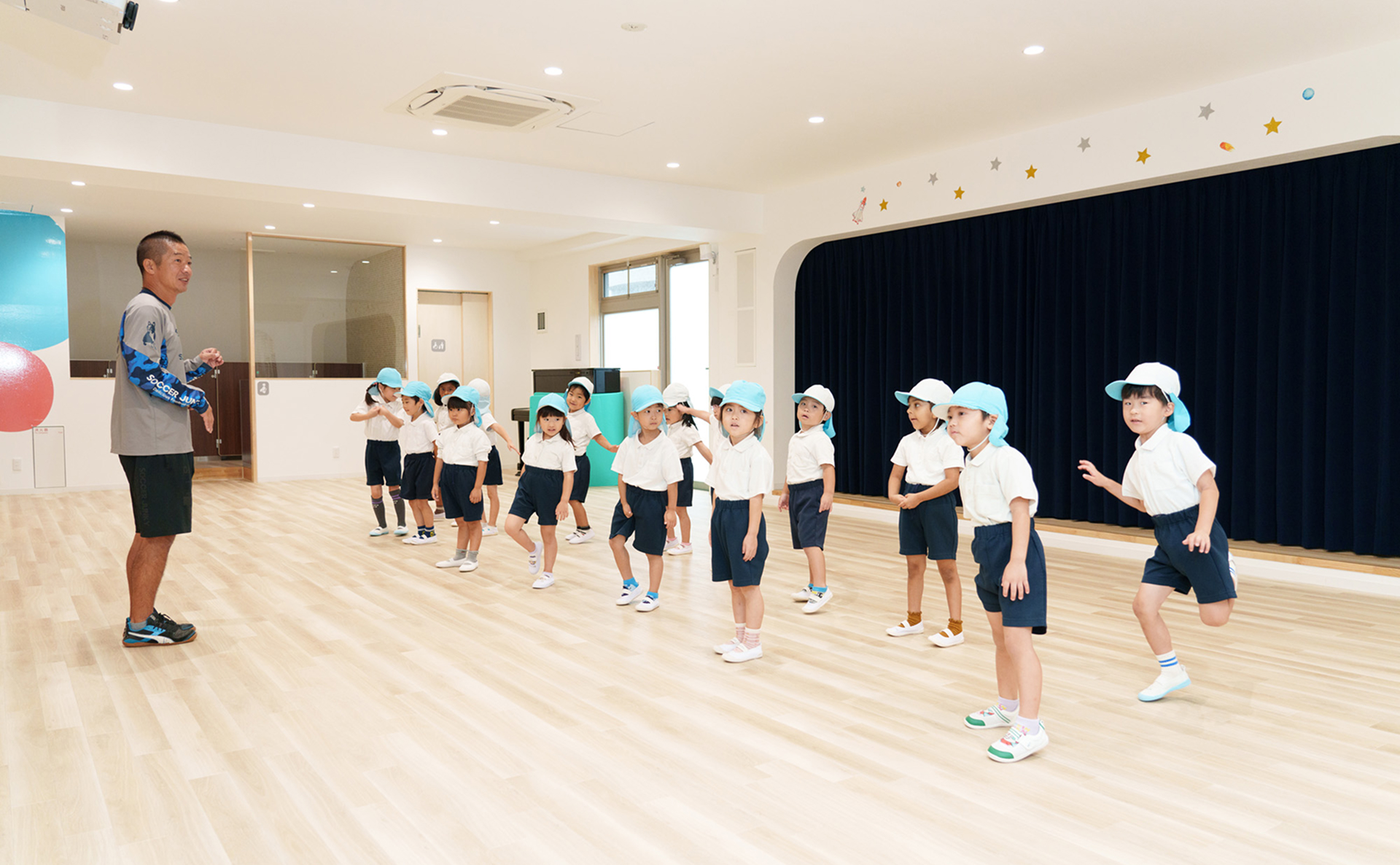 ホールでは乳児クラスが走り回ったり、幼児クラスが体操をしたりと身体を十分に動かして遊んでいます。またホールには5面が鏡面になている鏡の部屋があり、子どもたちは不思議な感覚に夢中で、ポーズを取ったり鏡を触ったりしています。