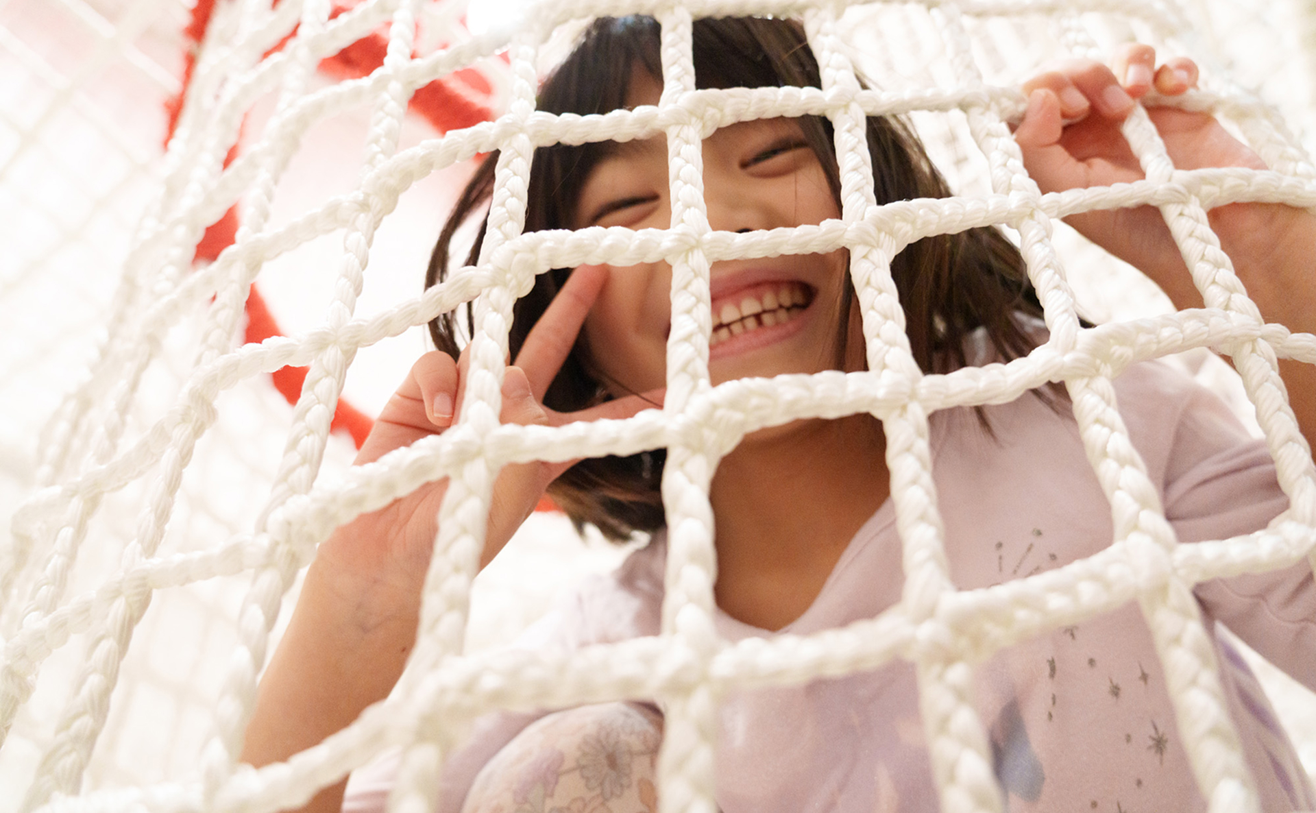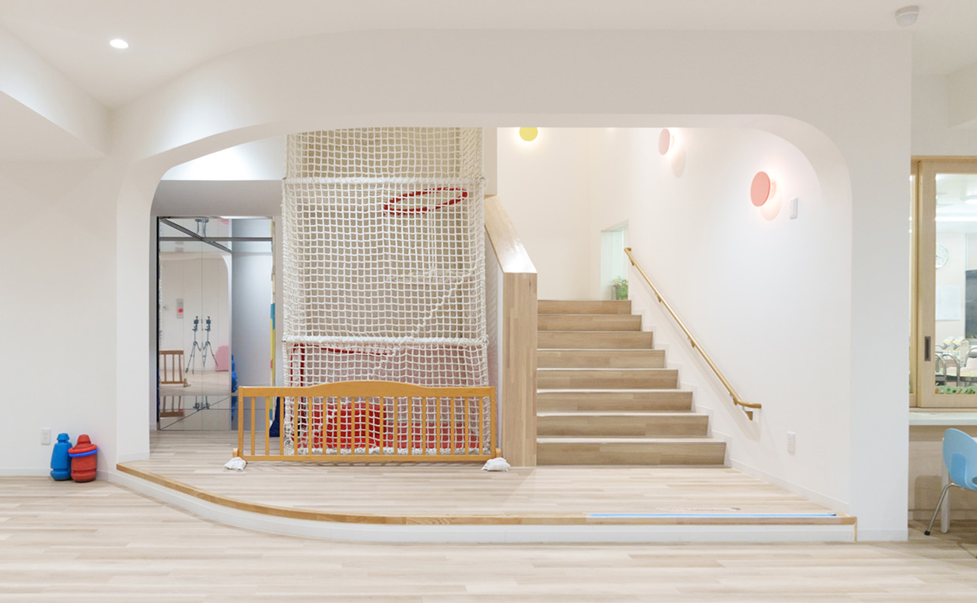 1階から2階の階段の吹き抜けを利用した大きなネット遊具があります。不安定な場所を登り降りを繰り返すことでバランス感覚や運動能力の向上に繋がっています。