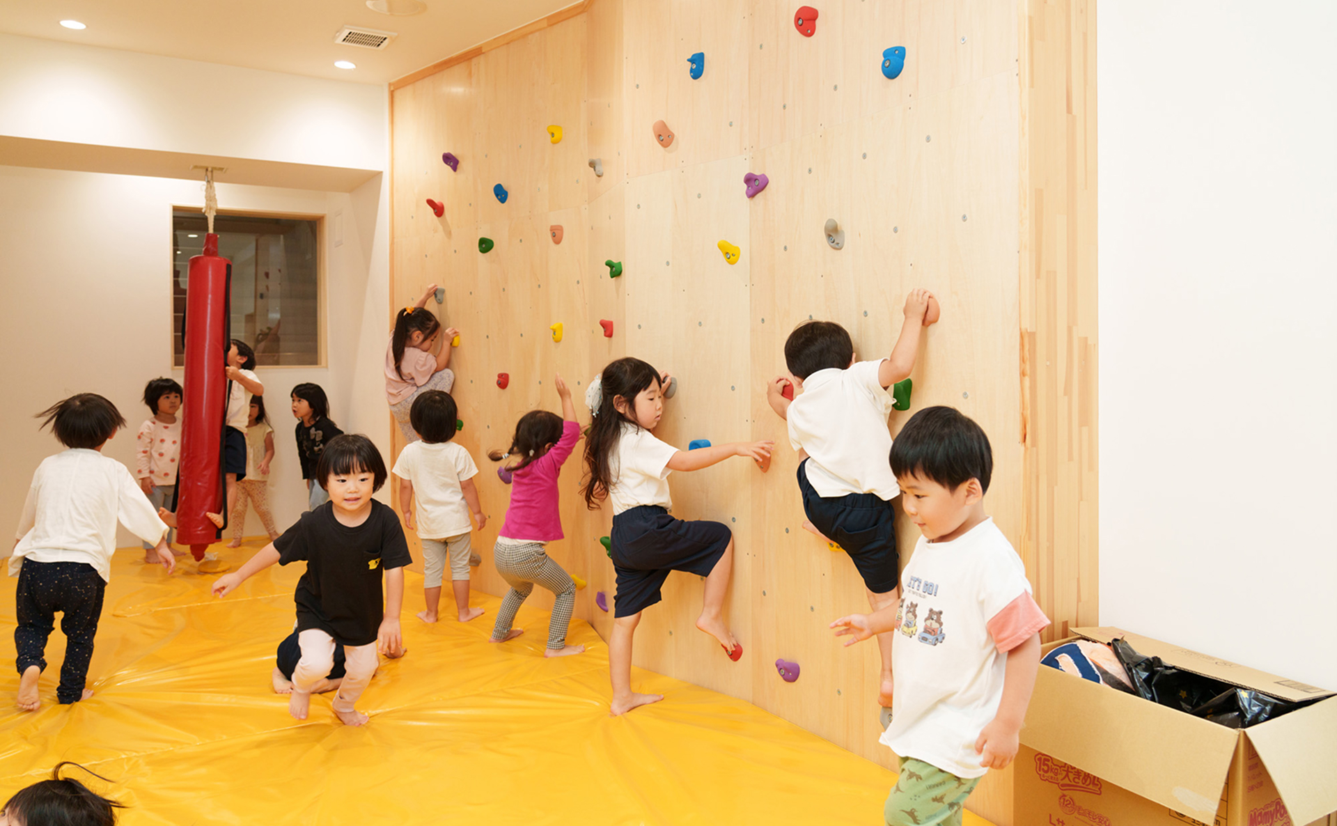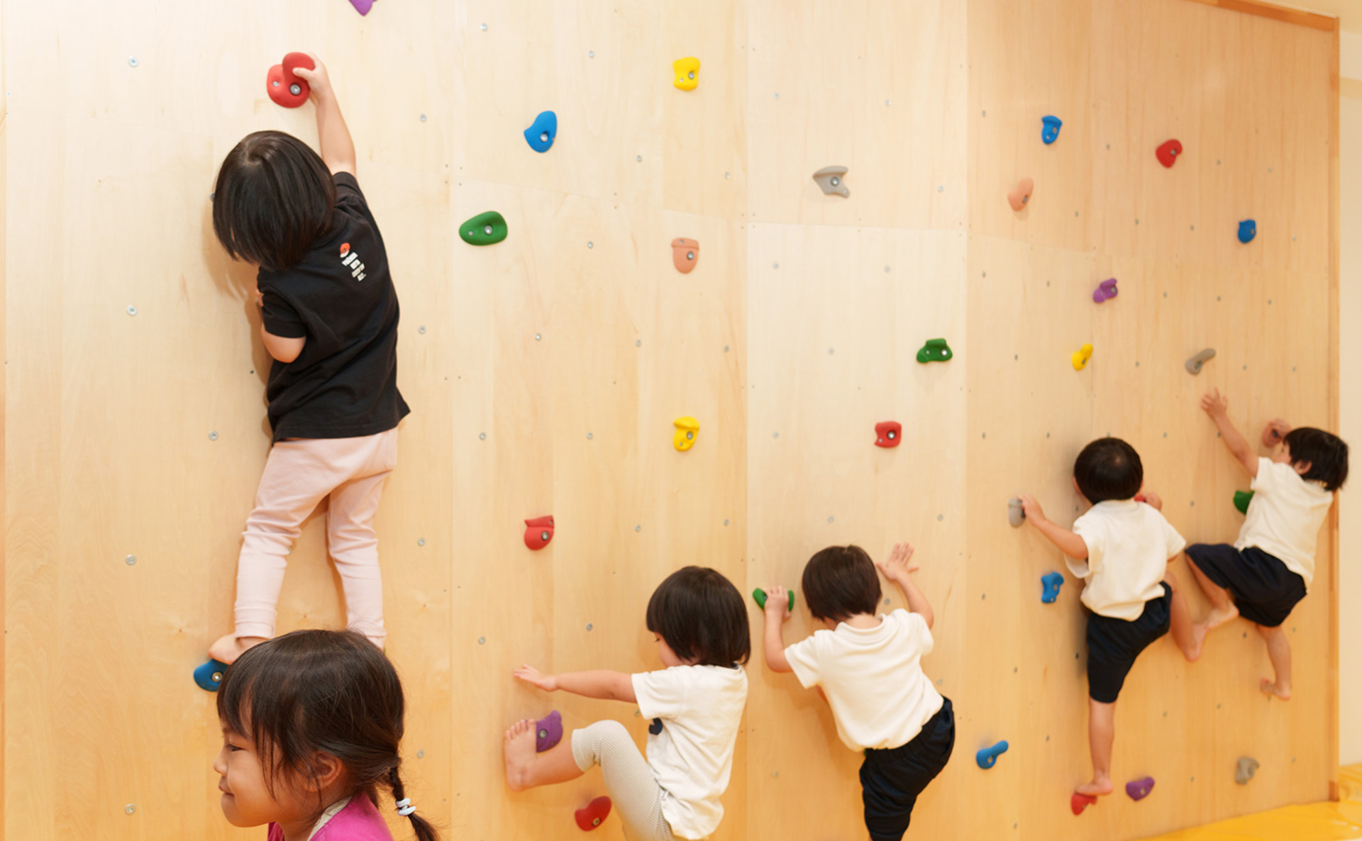2階のボルダリングルームは、運動能力の向上だけではなく、「どうやってバランスを保とう」「足をどこにかけよう」「次はどこを握ろう」など頭も使って遊ぶことで考える力も伸ばします。
