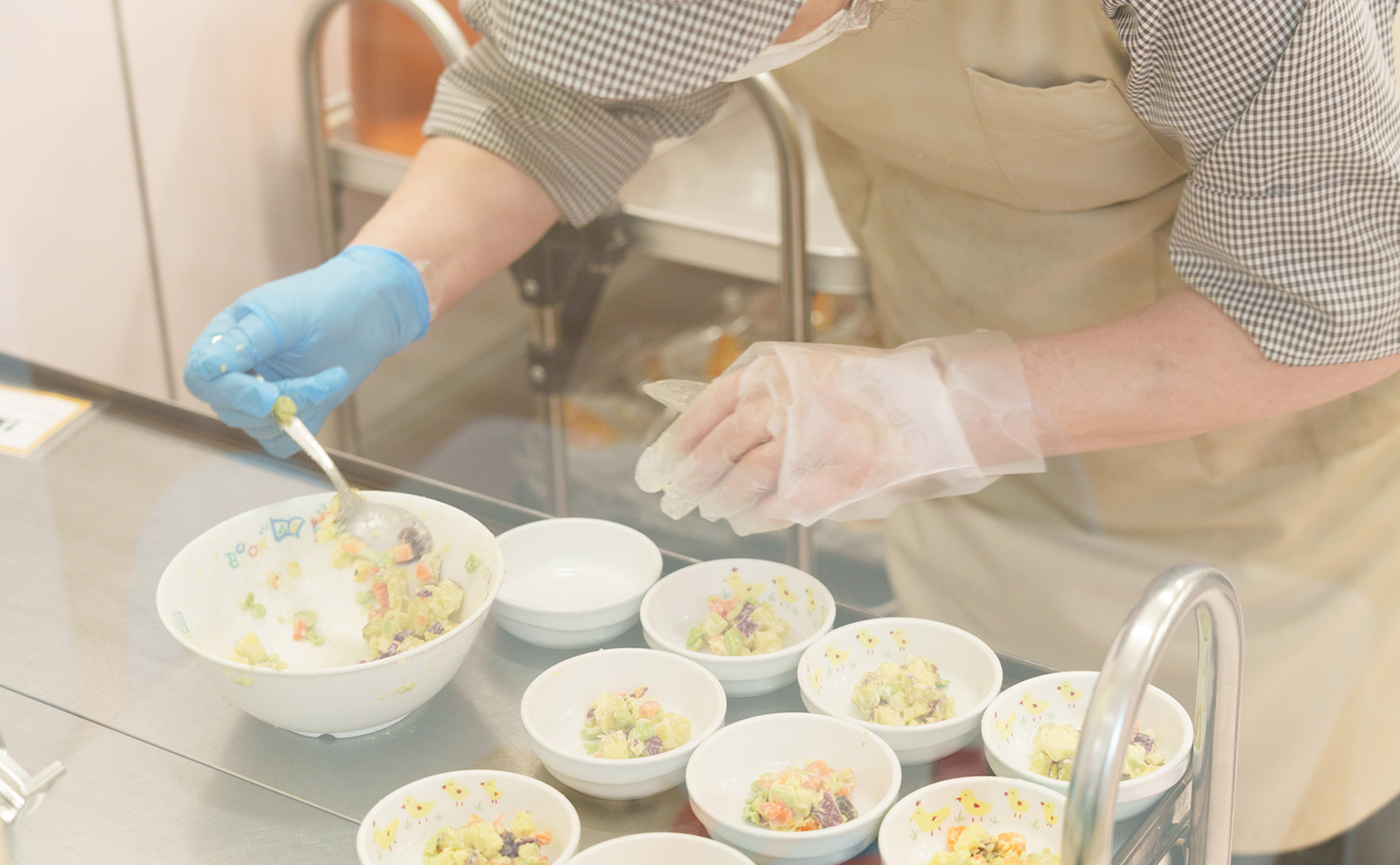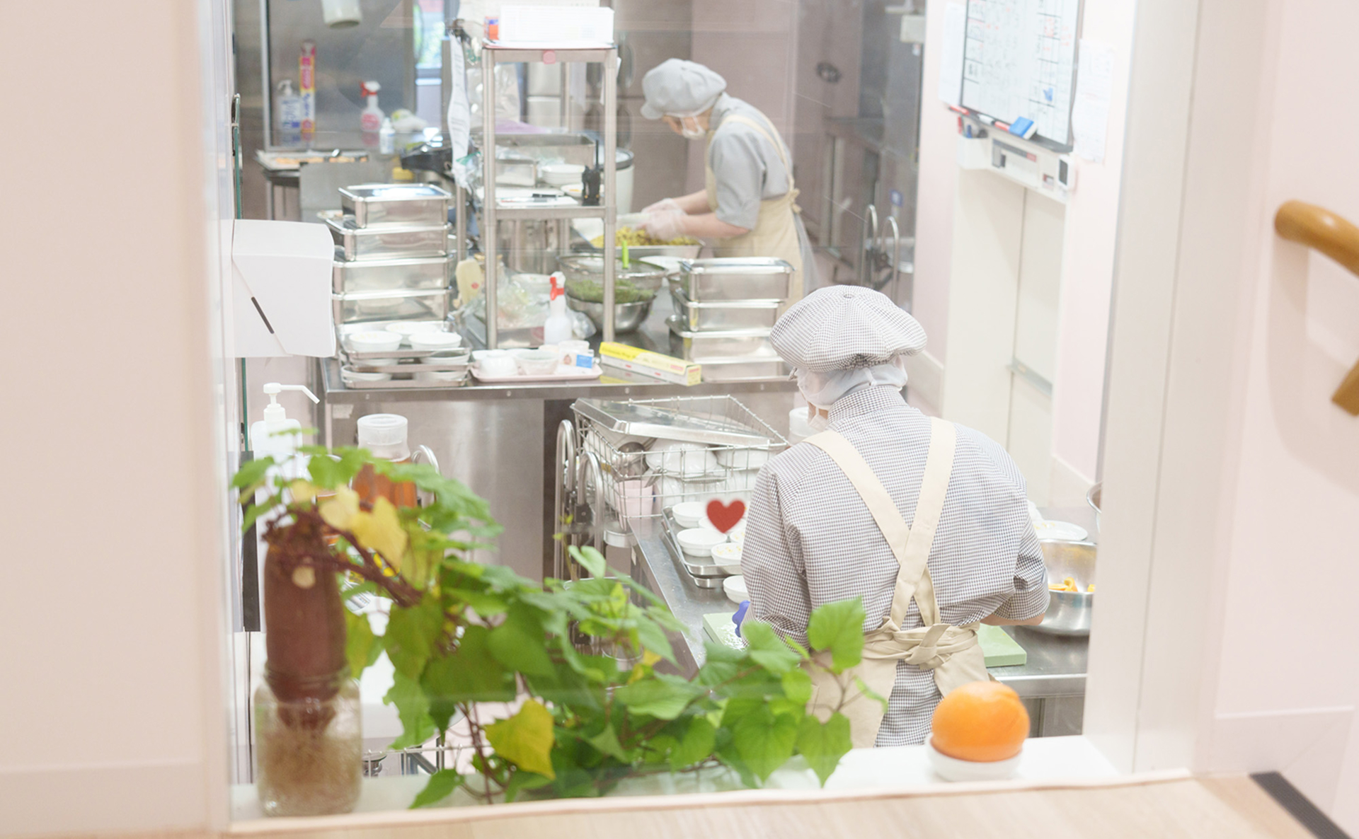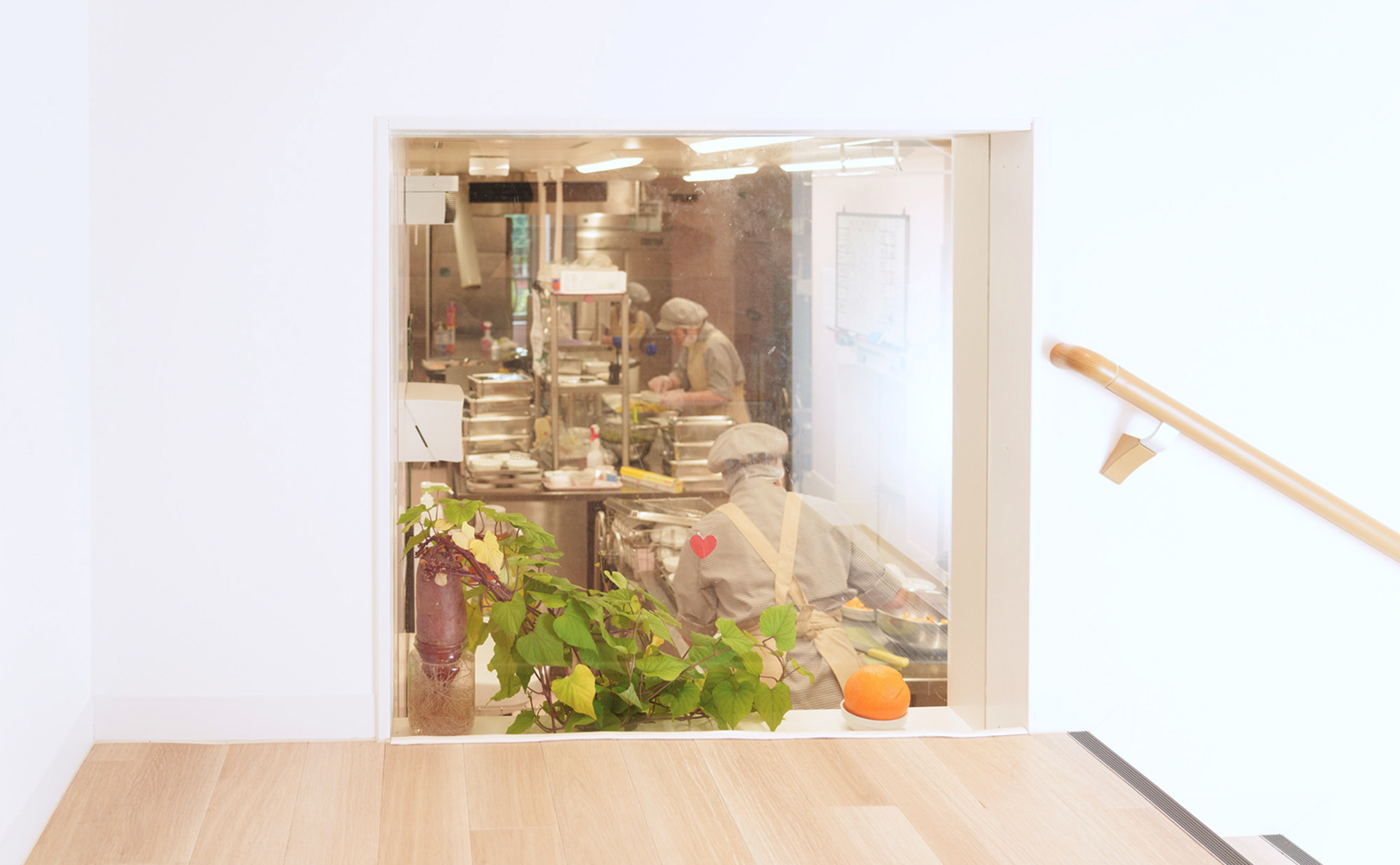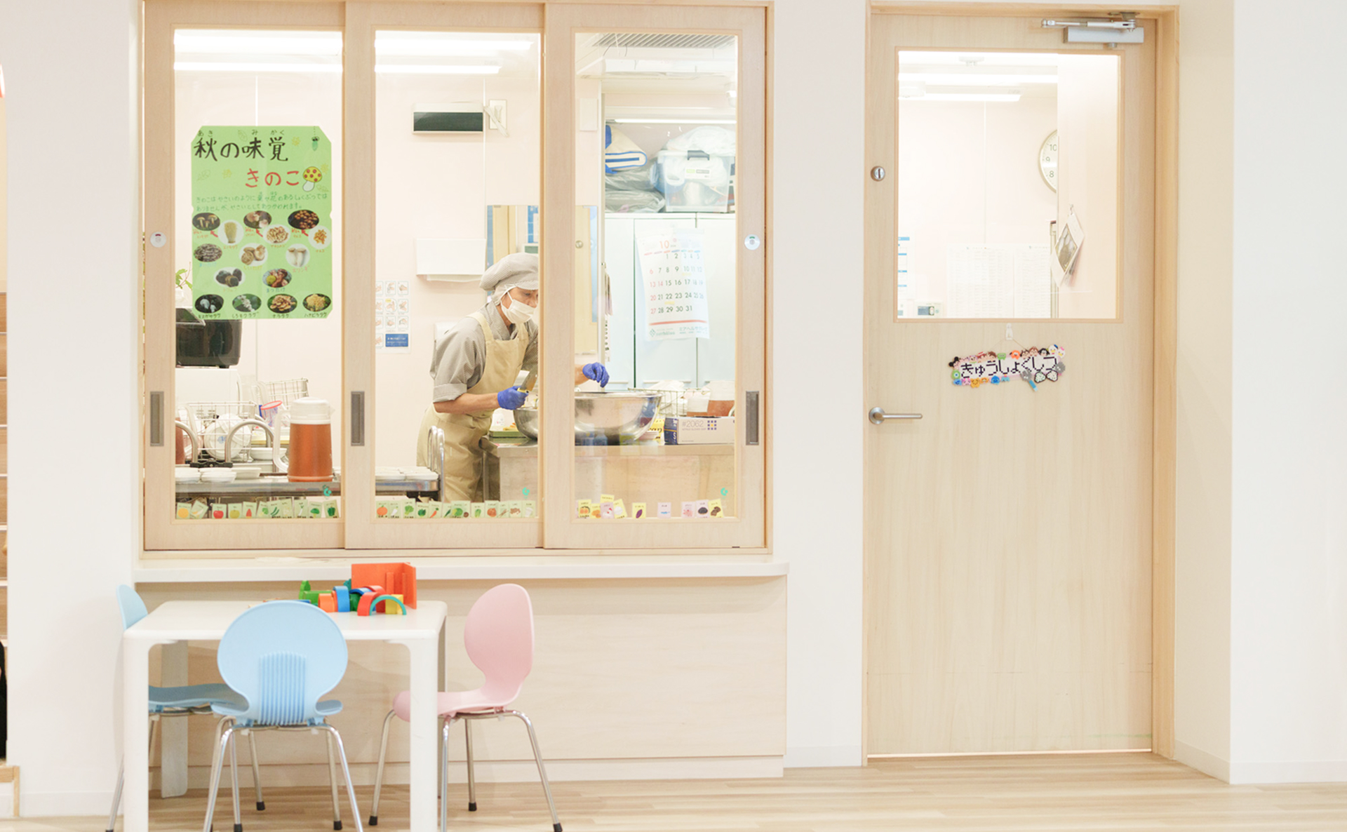 中の様子が見えるキッチンでは、調理の様子が見えたり、キッチンの先生とコミュニケーションしたり。食への関心を促す環境を設けています。興味が沸いておままごとでマネしてみたり、食事が作られる様子や作る姿をみたり。日々の生活の中にあることで、自然に「食」を意識できるようにしています。