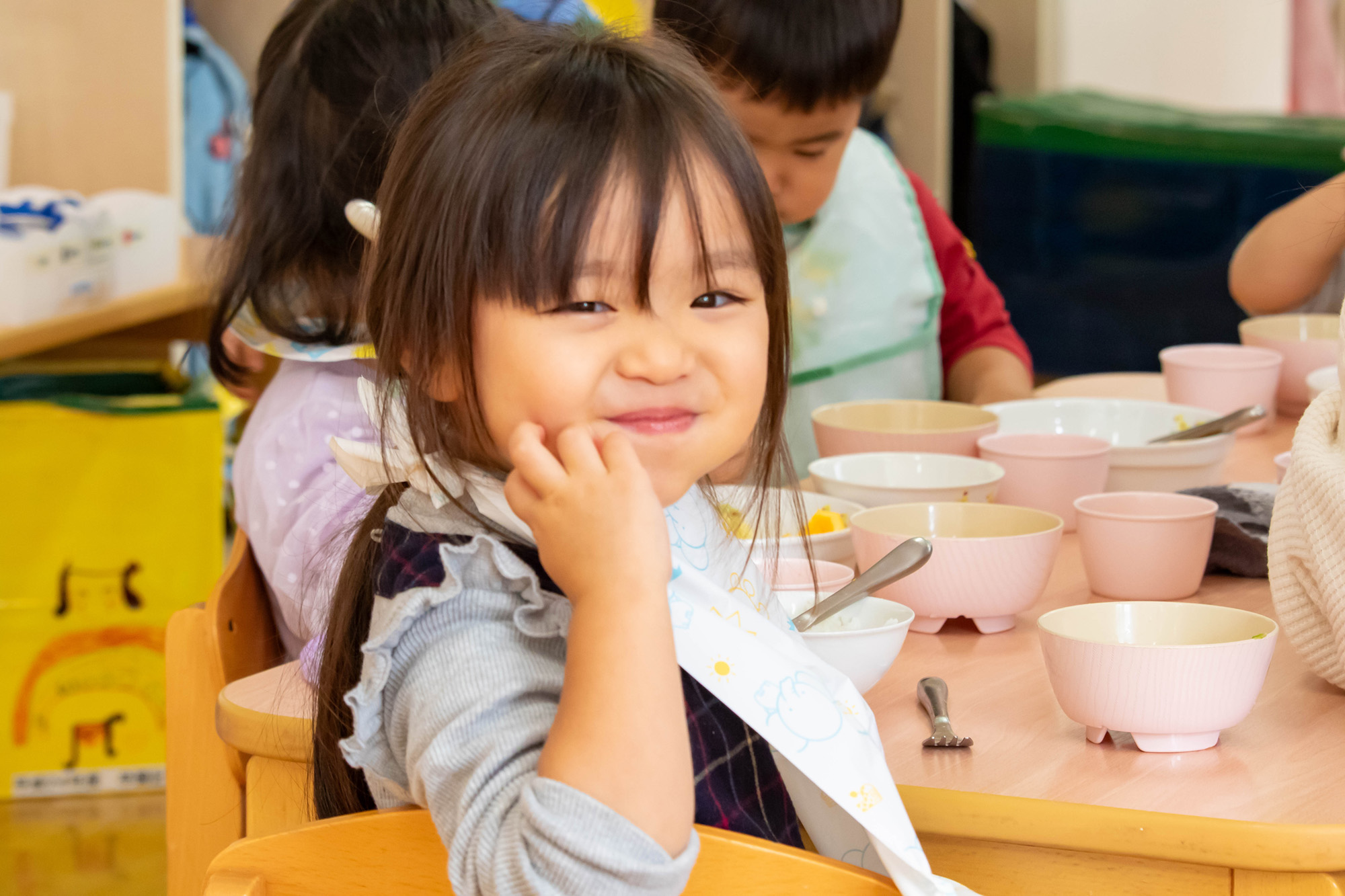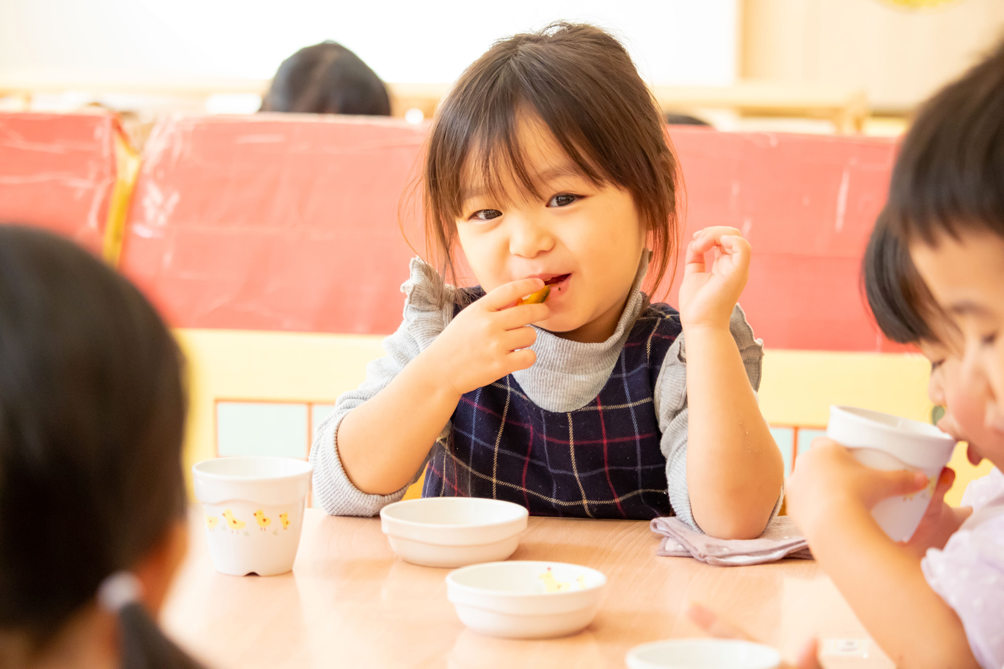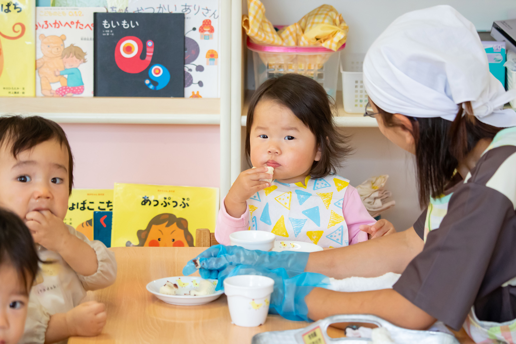 • 離乳食の進み度合いに合わせて、ミルクや自園で調理した蒸し野菜や果物を提供します。