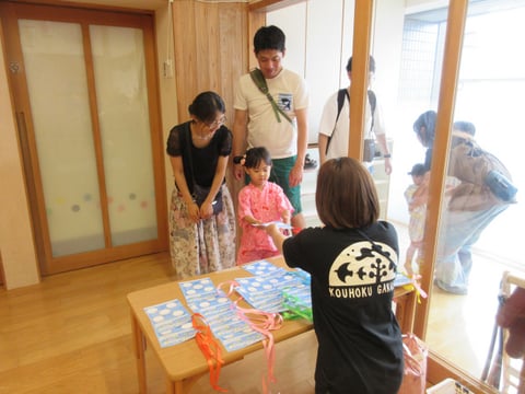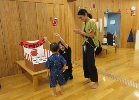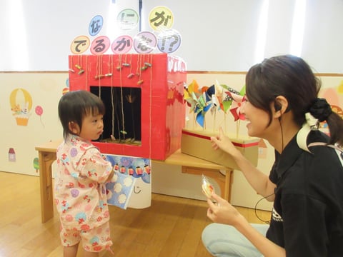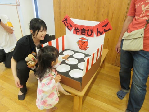 その日一日、園はおまつり会場になり、縁日の雰囲気一色になります。保護者の方と一緒にゲームや製作などいろいろなコーナーをまわったり、盆踊りをしておまつりを楽しみます。