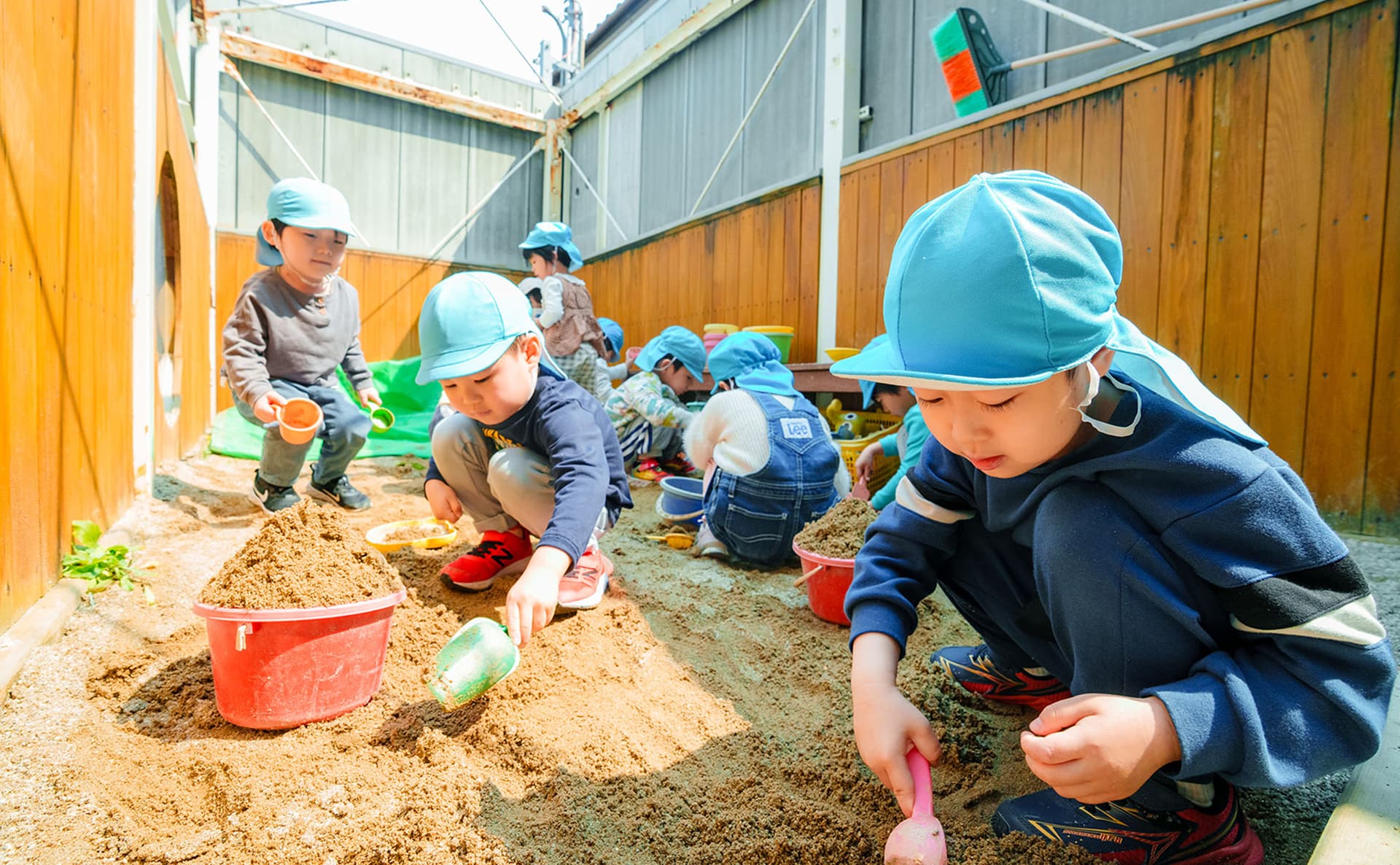 人口芝が敷かれた園庭や砂場があります。室内から繋がっているので、裸足で園庭に出ることもでき、水あそびや砂あそび、外あそびがいつでもできます。安心してのびのび活動できます。