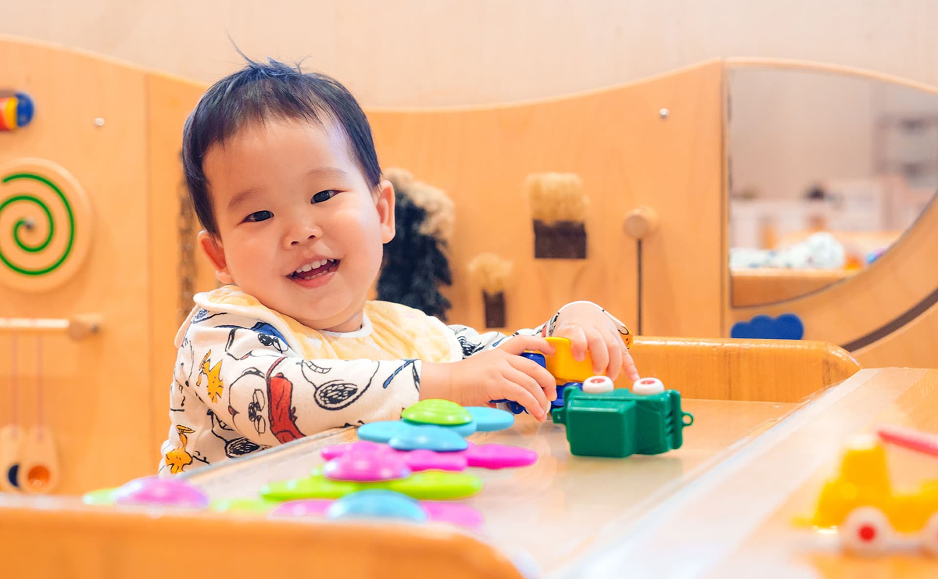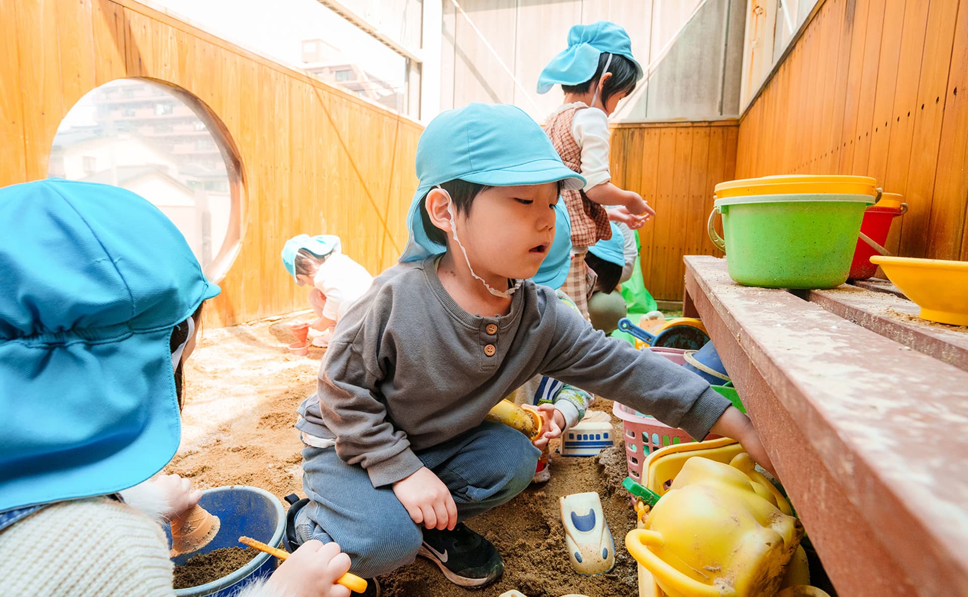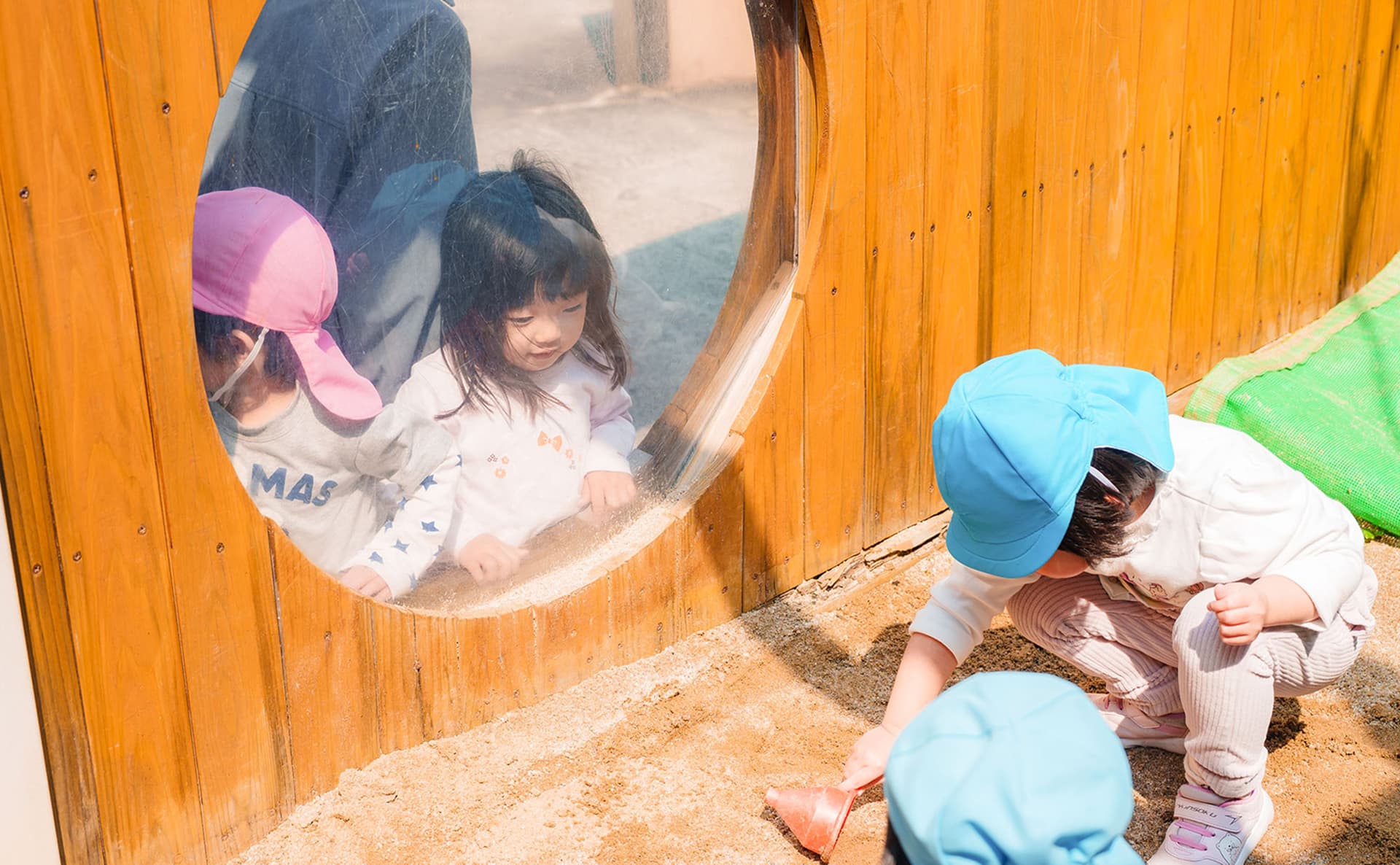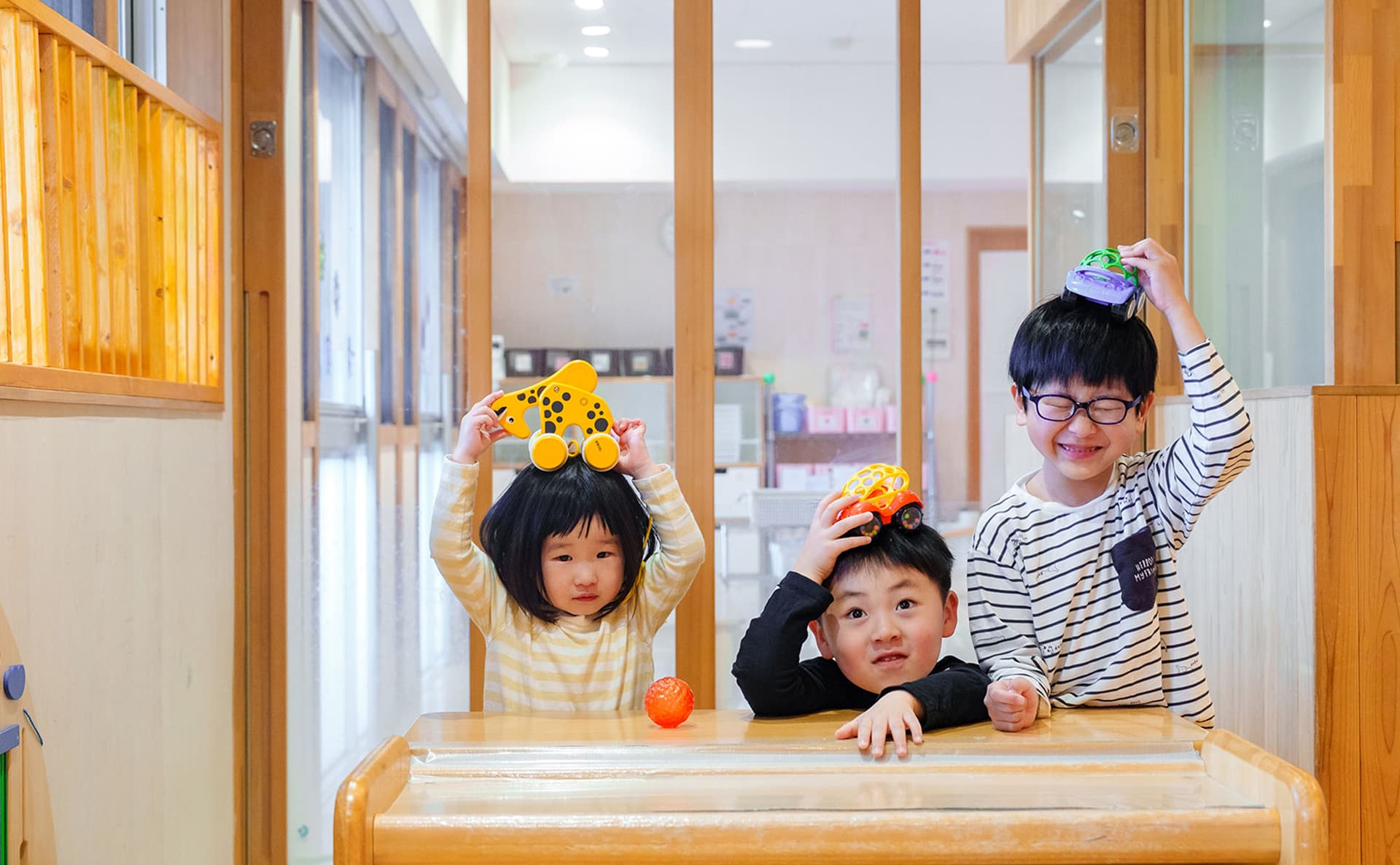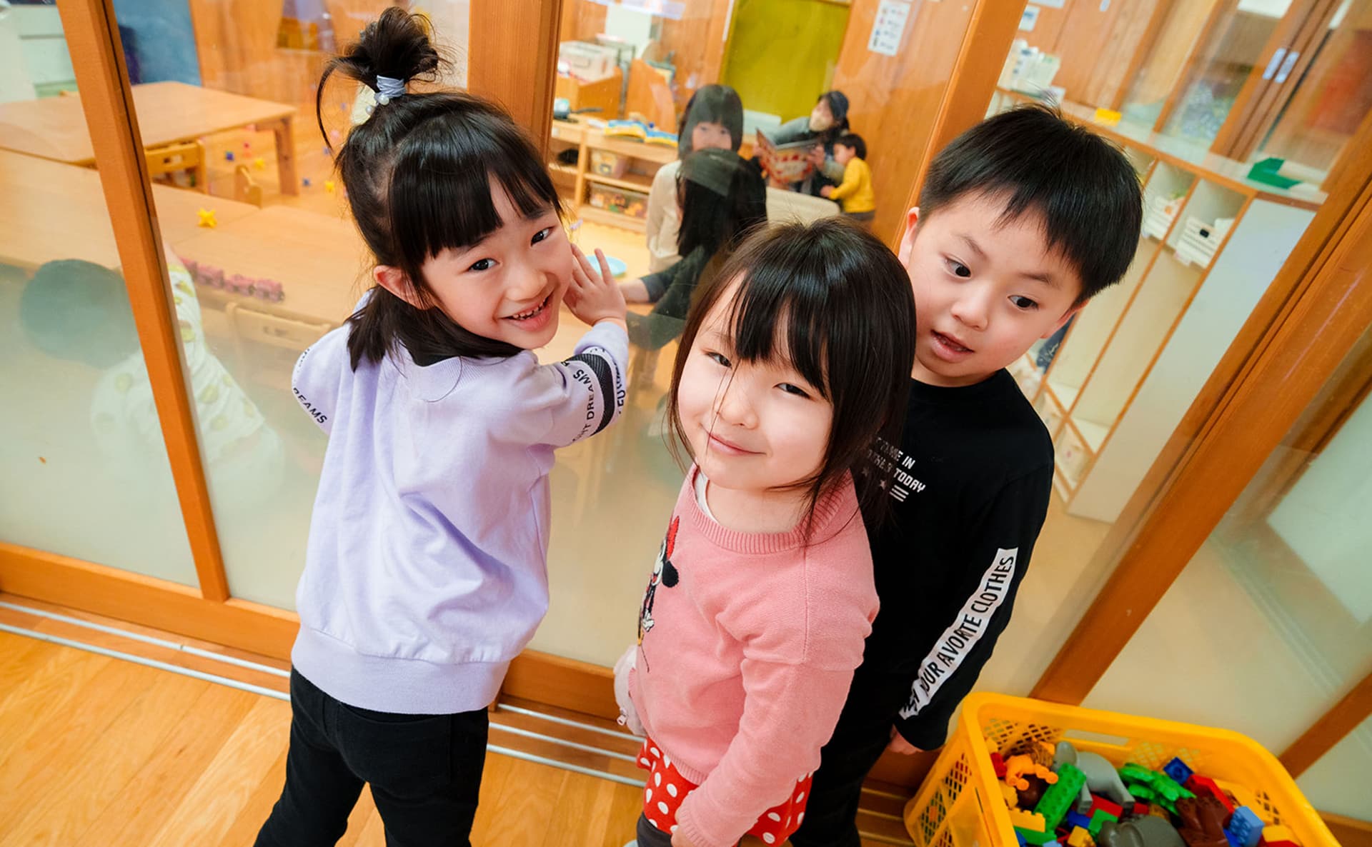 全年齢の子どもたちが過ごす1階のフロアは、お部屋の区切りの壁が上から下まで全てガラスになっています。園全体に目が届きやすく、また子どもの目の高さでも他のお部屋の子どもたちの様子が見えるので、それぞれの存在を感じながら過ごせる、繋がりや安心感のある空間になっています。