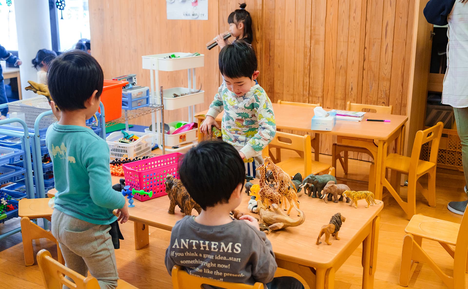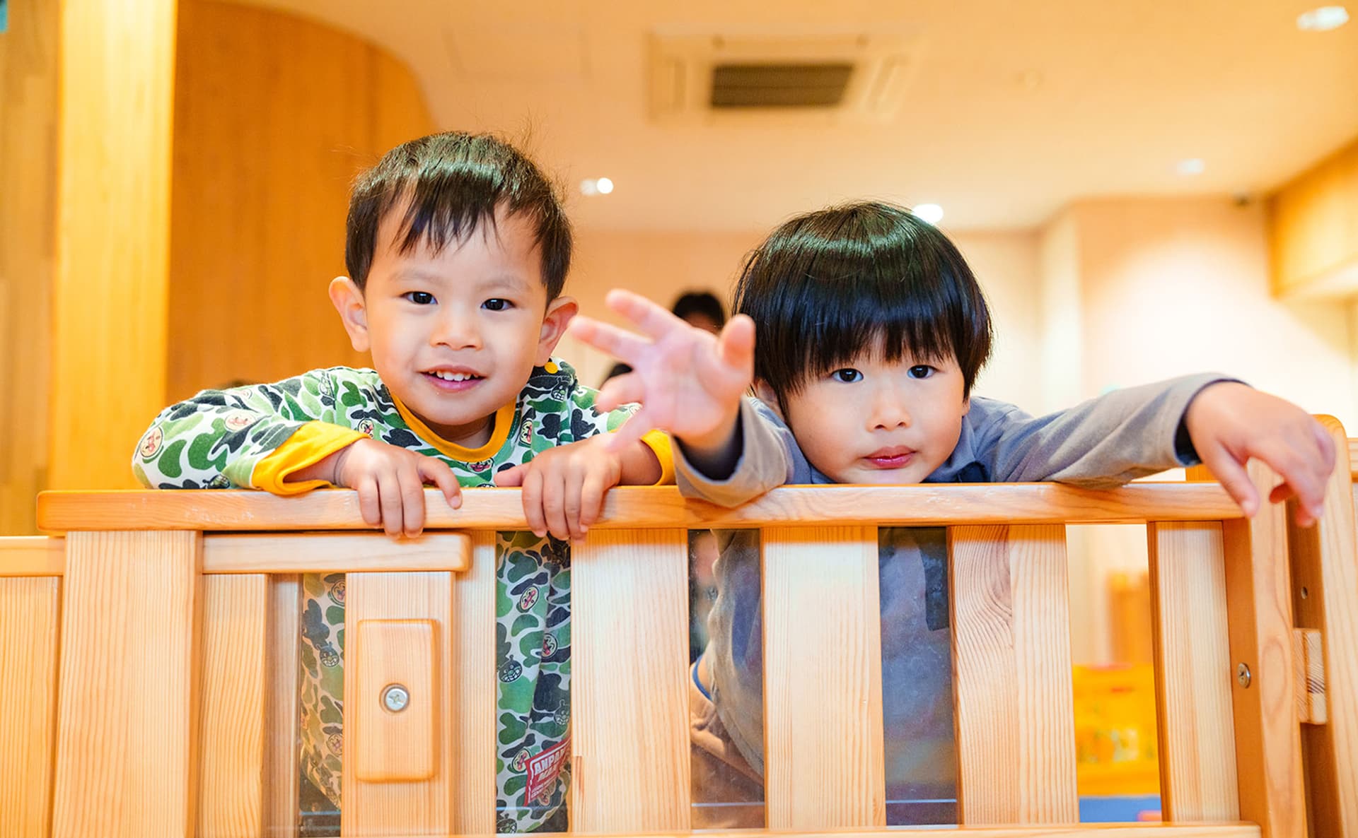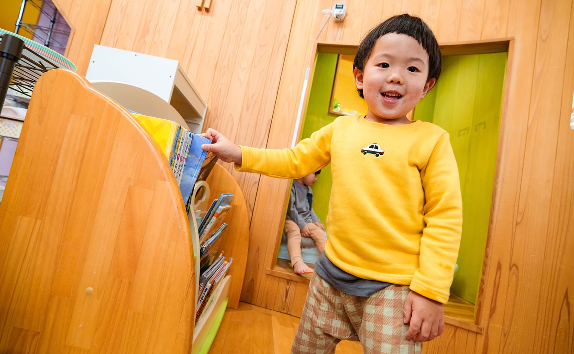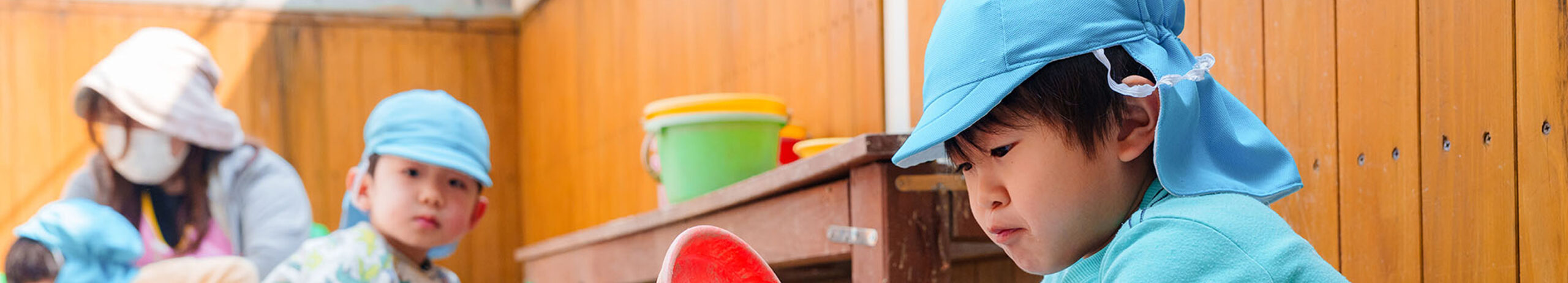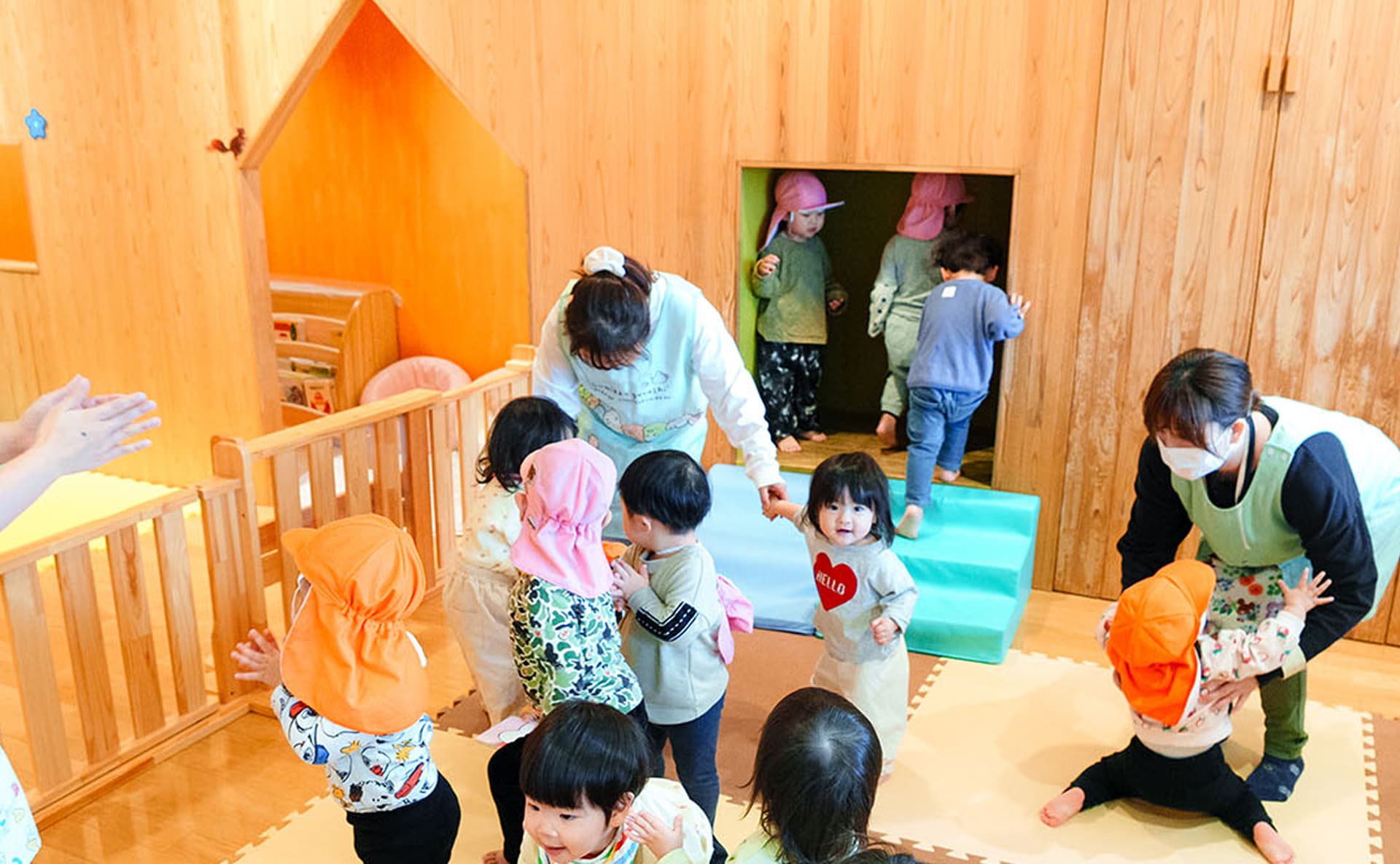 園内は木の温もりがあふれる造りです。木の自然な色合いは、子どもたちの心を落ち着かせる効果があり、家庭のような温かい雰囲気をつくります。園が子どもたちにとって安心できる場所、のびのびあそびを楽しめる環境となるよう、家庭的な雰囲気を大切にした保育を行っています。