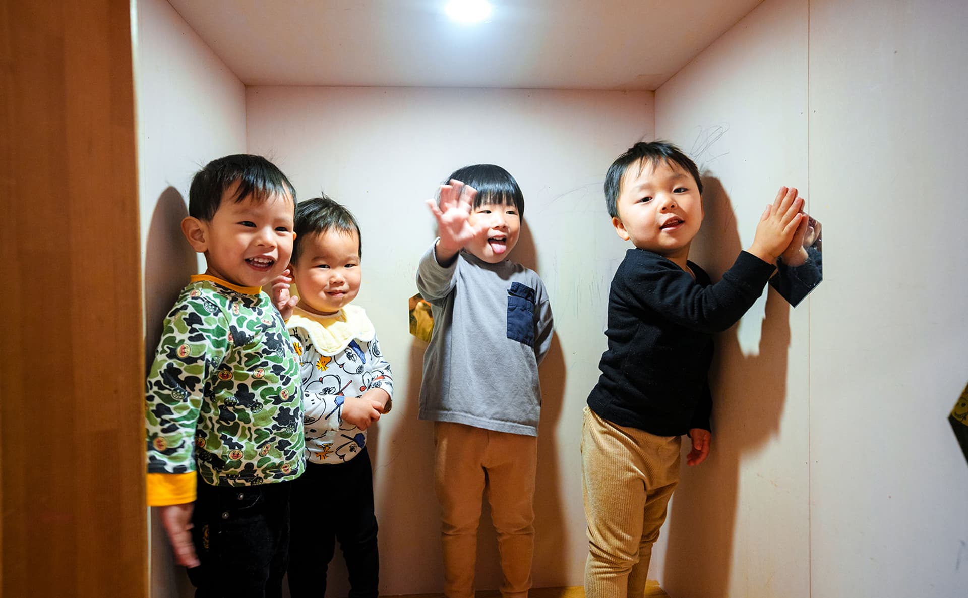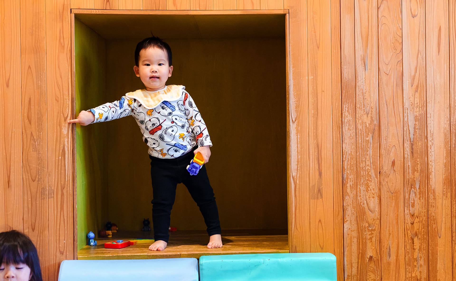 園内には、子どもたちが一人で静かに過ごしたり、気持ちを落ち着かせたりできる空間(DEN)を設けています。子ども数名が入れるくらいの小さな空間で、一人で過ごしたり少人数のお友だちと過ごしたり使い方はいろいろ。