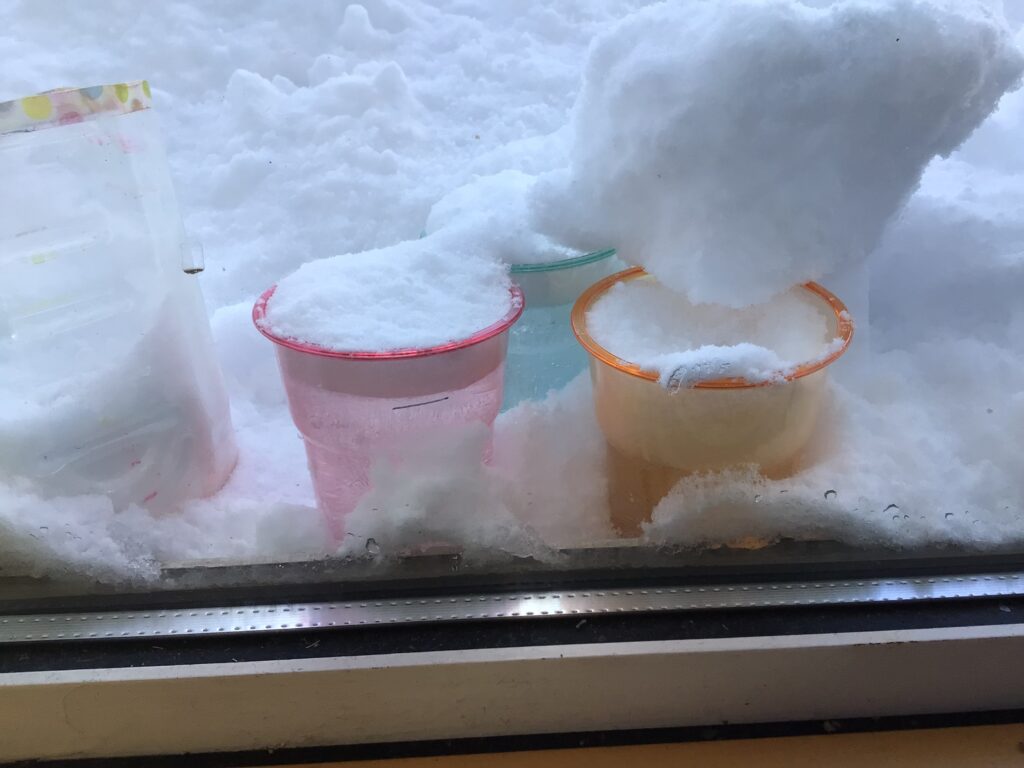 「ゆきがふってカップのうえにつもった