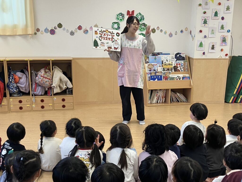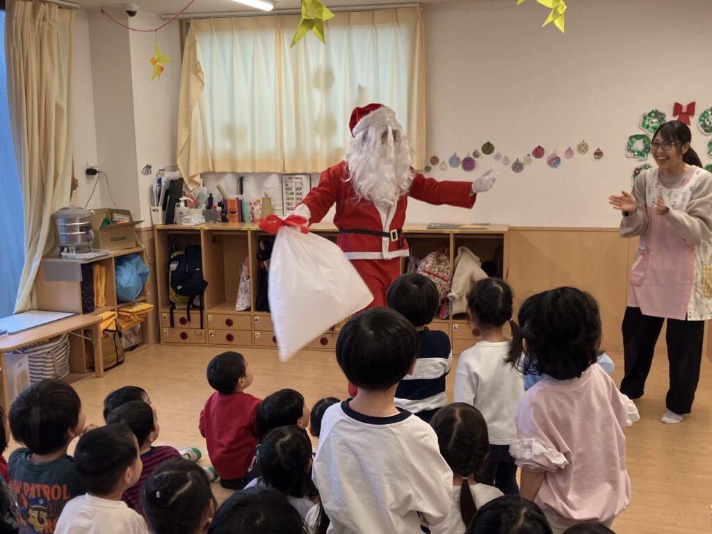 クリスマス会 ―サンタさんが来てくれました― 2025.12.24 園の様子 芦花ゆりかご保育園ではクリスマス会を開催しました。 赤鼻のトナカイの歌の後はクリスマスのお話です。 クリスマスにまつわるいろいろなものの意味や由来を話してもらいました。 プレゼントを持ってサンタさんもきてくれました。 クラスごとに担任の先生が代表してプレゼントを受け取りました。 どんなプレゼントをもらったのか、おうちに帰るまでのおたのしみです 今日はみんなの家にもサンタさんが来るのでしょうか