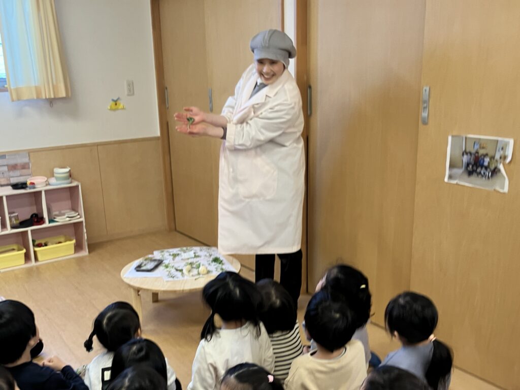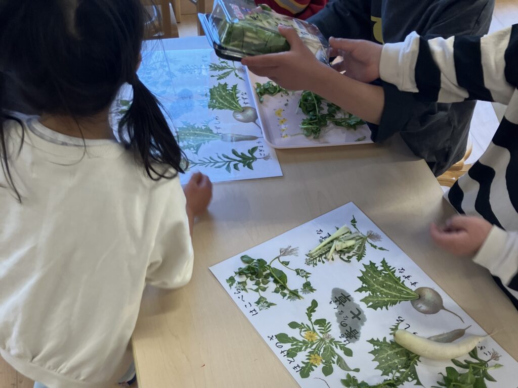 春の七草 2026.01.09 おやつに七草がゆ(風)が出ました。 おやつが終わった子どもたちが保育室に戻ると、机の上には「春の七草」が並べてありました。 一つ一つ手に取ってにおいをかいでみたり、引っ張ってみたりと、子どもたちなりの探求の時間です。 みんながおやつを食べ終わり片付けが済むと、栄養士の先生が春の七草や七草がゆについてお話してくれました。 一つ一つ手に取って見せながら話していると、子どもたちの視線はキラキラ輝いて引き込まれていきました。