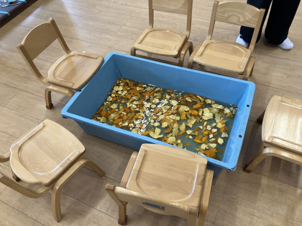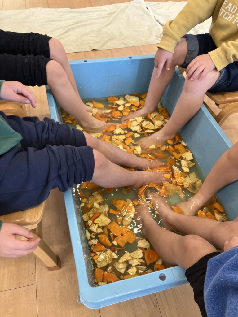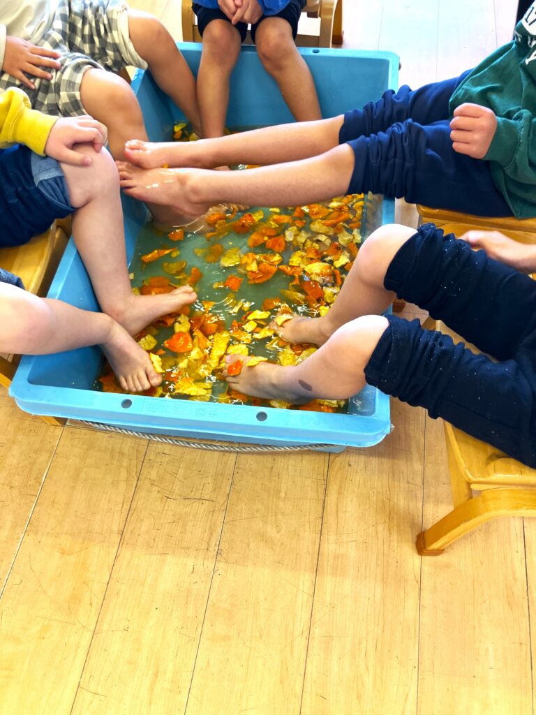 足湯体験してみました ー ミカン風呂 ー 2026.03.02 園の様子 給食で出たみかんの皮を集めて、乾燥させておきました。 今日は出来上がった陳皮をお湯に浸してミカン風呂の完成です。 みんなで入るには小さすぎたので、順番に足湯体験です。 保育室内にはミカンの香りが広がりました。 慣れない体験だったのか、においが強すぎたのか、「ちょっとくさい」という意見も出てきました。 慣れてくると、楽しくなってきたのかみかんの皮を足にのせたりして遊び始めました。 しっかりと温まって、風邪に負けないようにね。