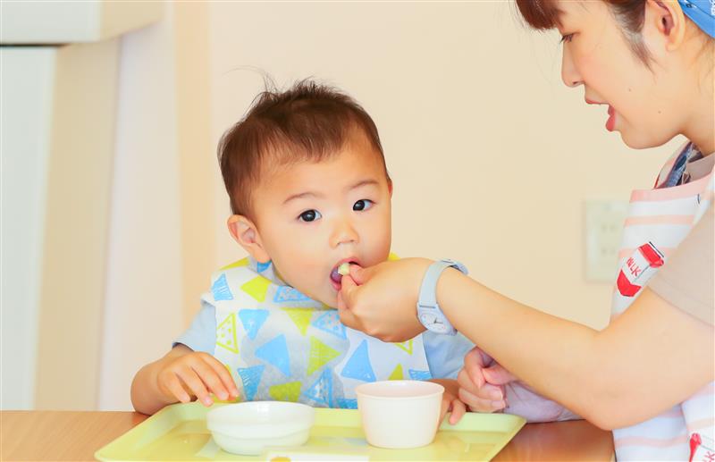 子どもたちの発達に合わせて咀嚼しやすい形・大きさで提供しています。安全に離乳食を提供できるよう、ご家庭での状況を把握するために保護者様には毎月面談のご協力をお願いしております。