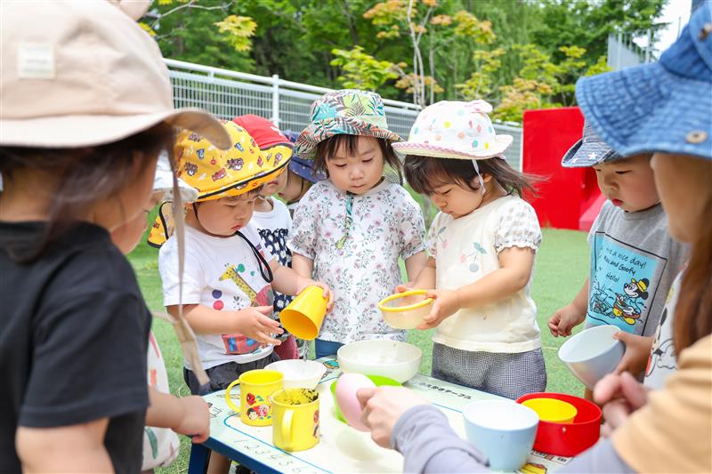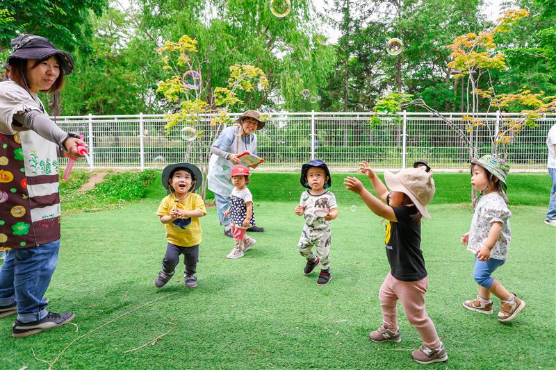 子ども達の興味関心、成長や発達に合わせた活動を行います。五感を刺激する室内あそびのほか、近隣の公園へのお散歩や園庭などで自然あそびを多く取り入れています。
