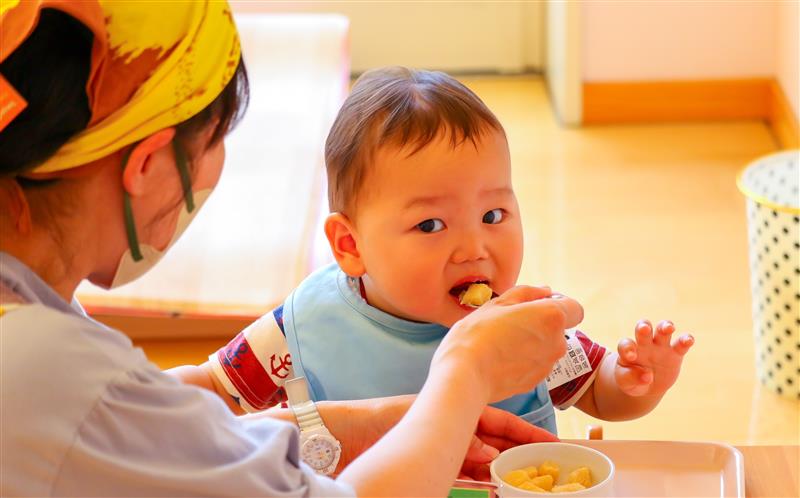 離乳食の進み度合いに合わせて、ミルクや自園で調理した蒸し野菜や果物を提供します。