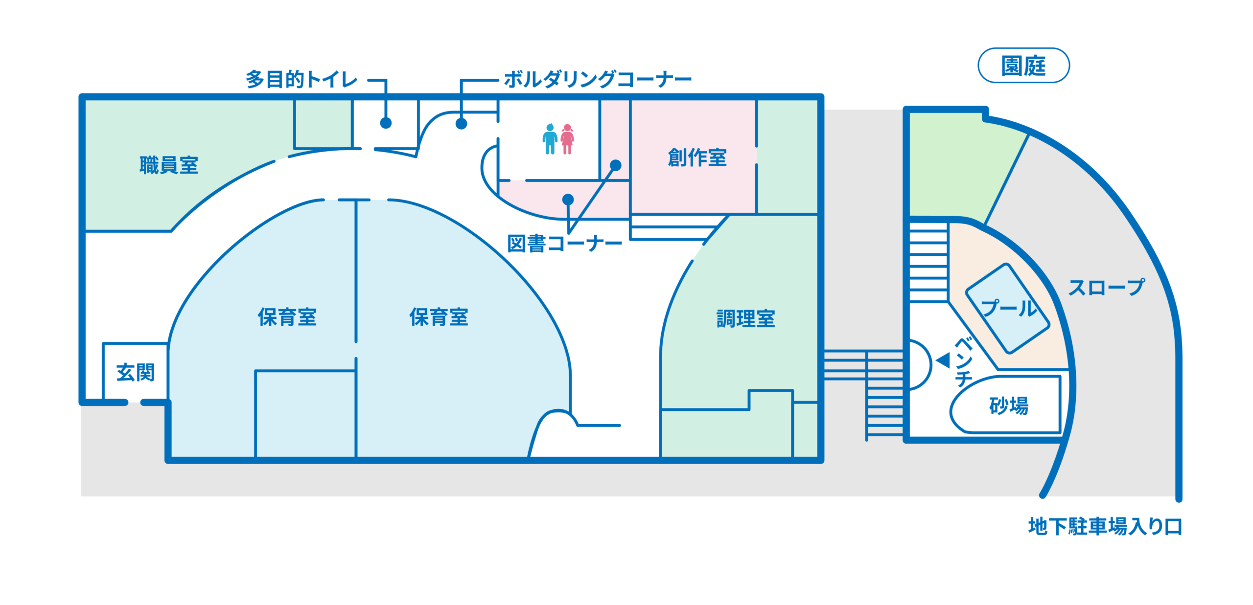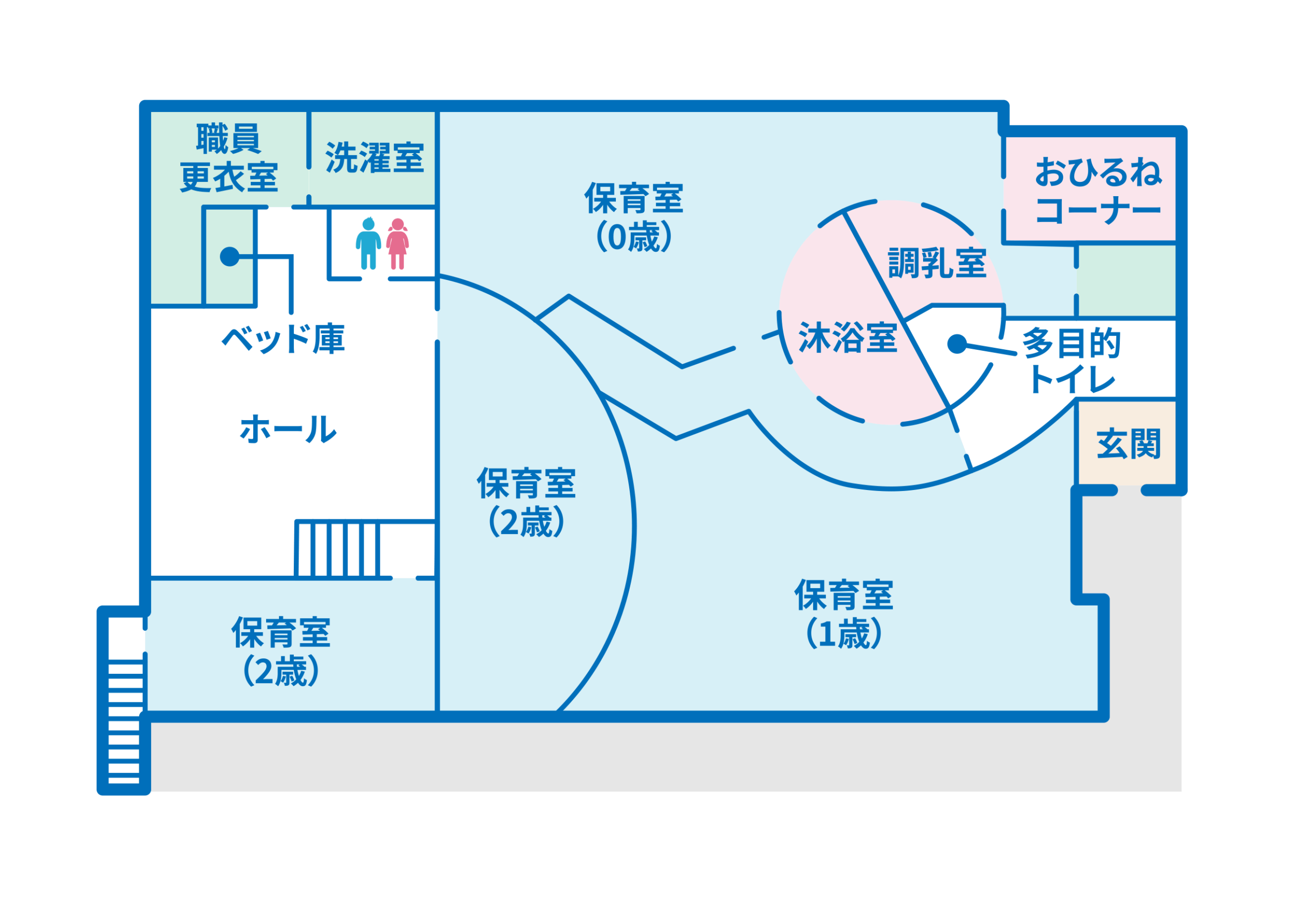 保育空間を乳児と幼児とで分けています。乳児はゆったりと過ごせる環境をつくり、幼児はワイワイと好きなあそびを思い切り楽しめる環境づくりを行っています。