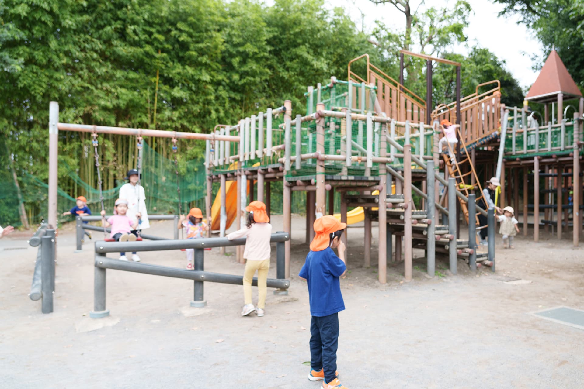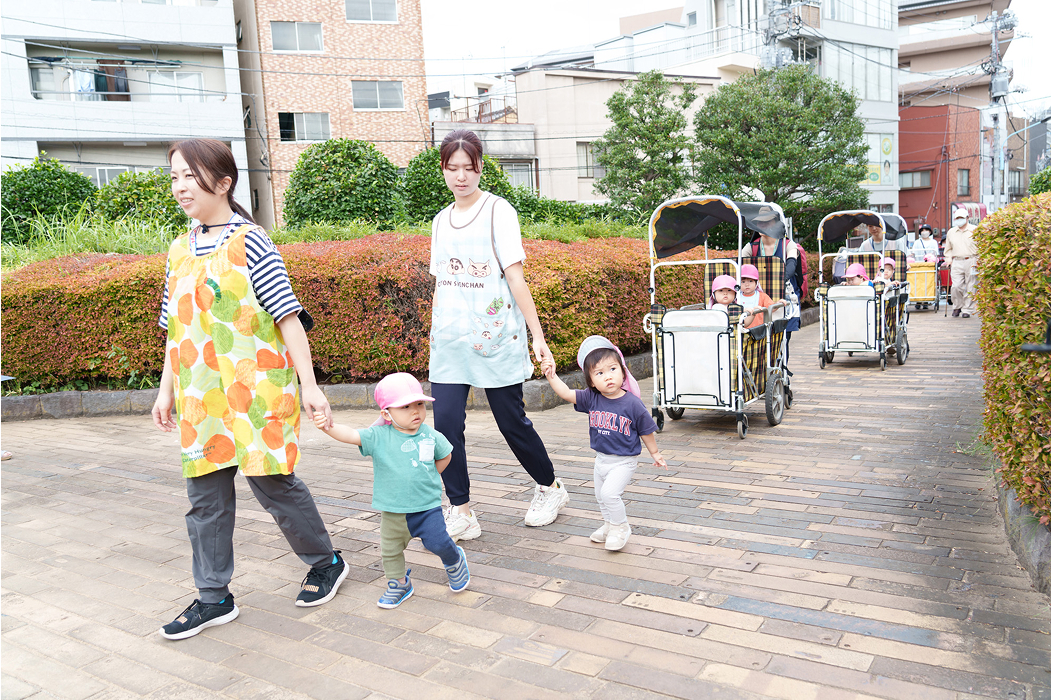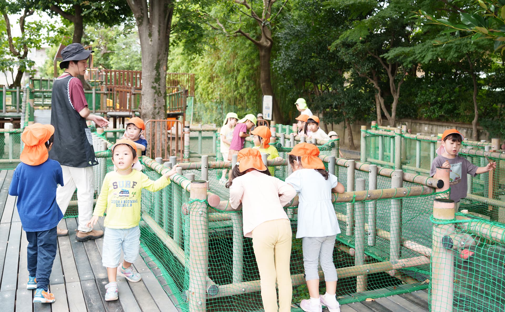 近くには自然豊かな公園があり、お散歩コースとなっています。都心の住宅街にある園ですが、園庭や公園など自然に触れられる環境があり、五感を刺激する外あそびや自然あそびを積極的に行っています。