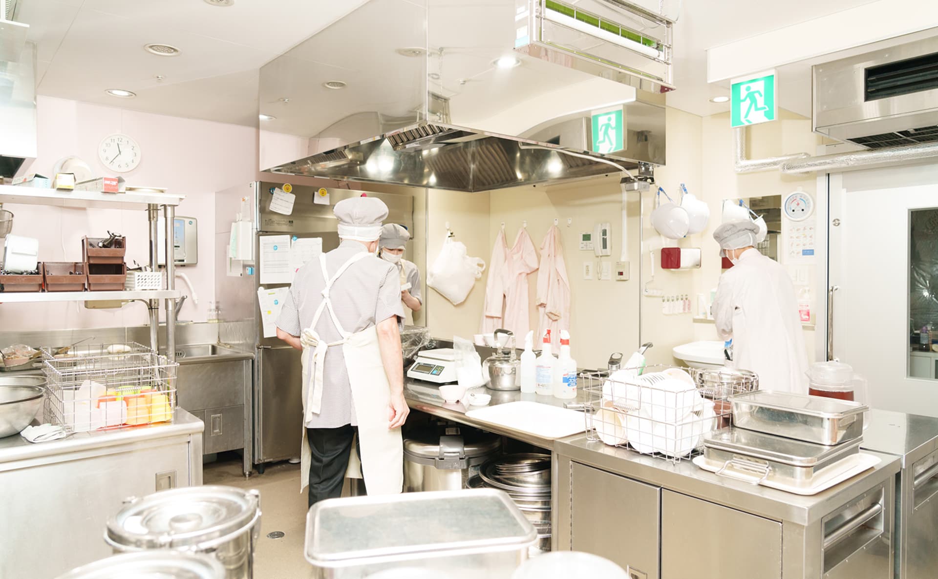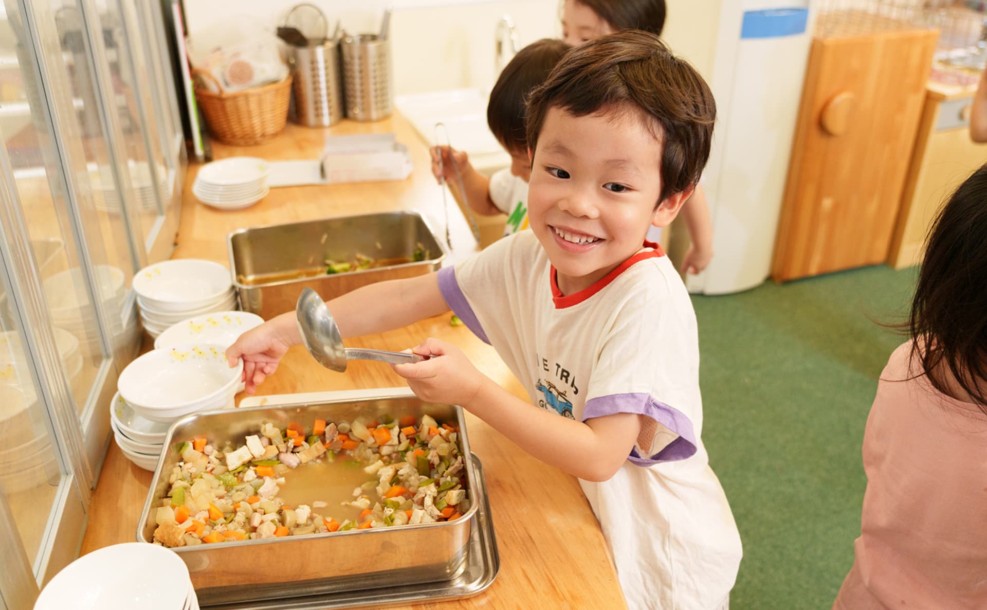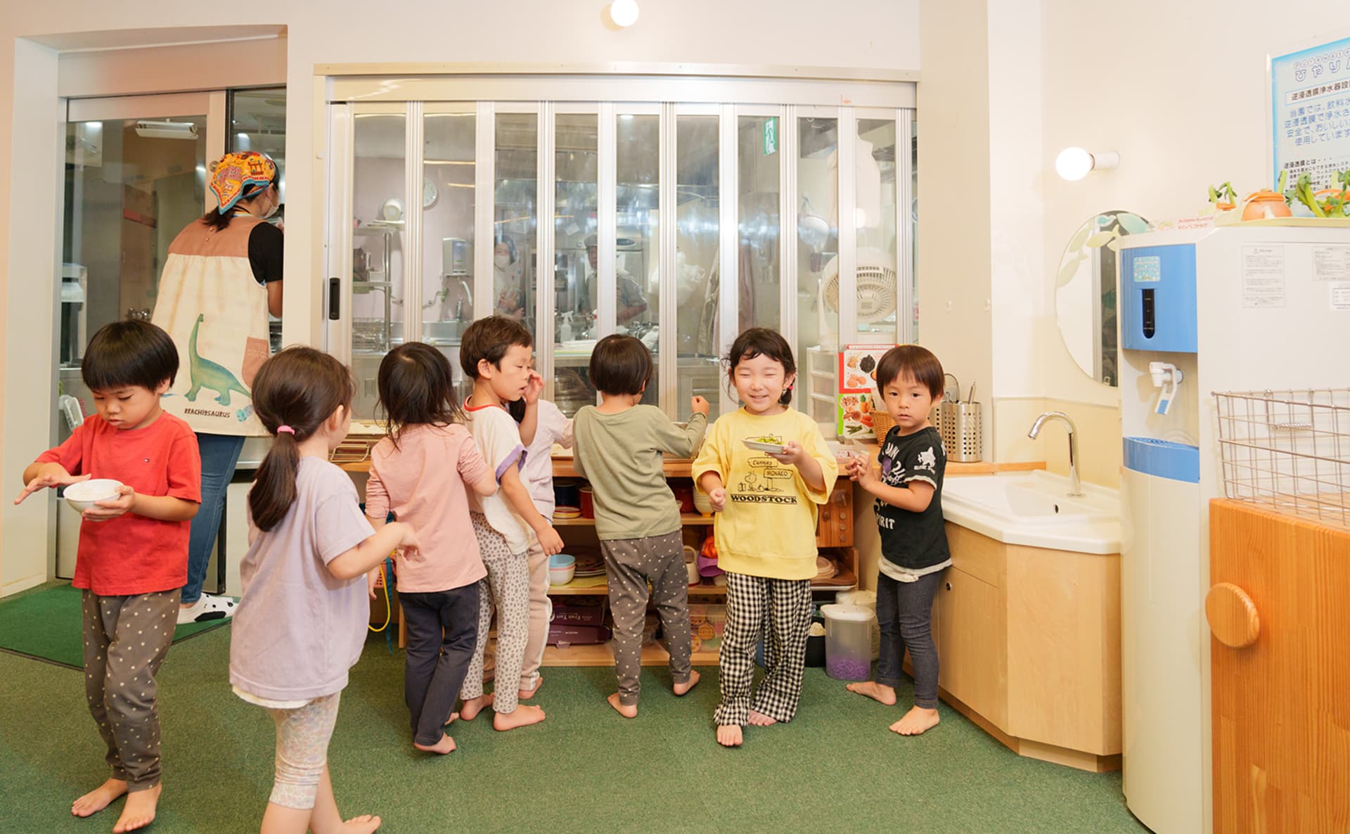保育室に面したキッチンはガラス越しに中の調理の様子が見えるようになっています。調理の先生とのコミュニケーションが日常的にあります。調理の様子を見ながら、おままごともで来ます。