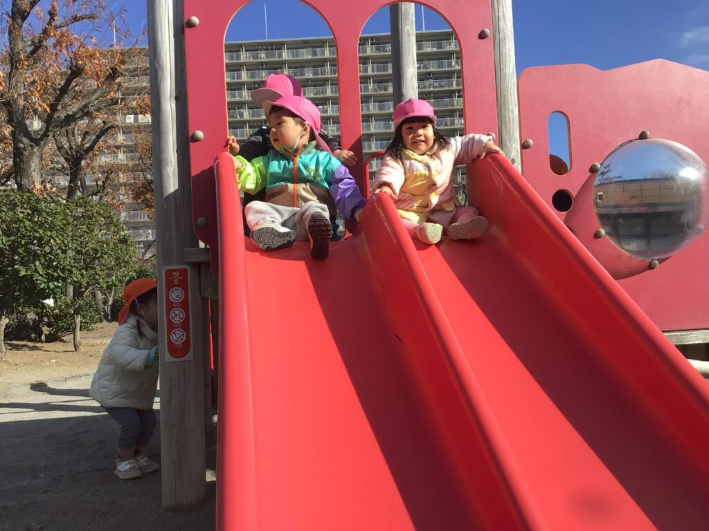 一緒に滑り台を滑ってみたり
