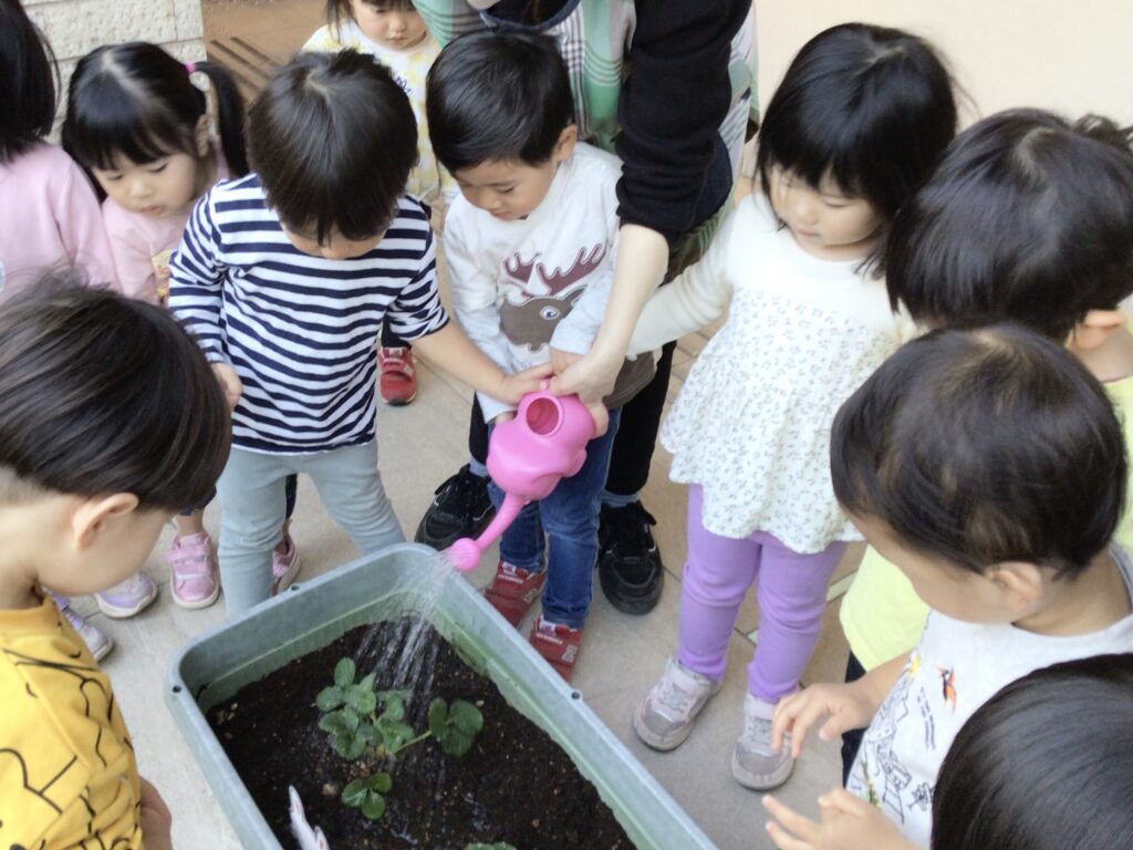 お友だちと一緒にジョウロを持ち、上手に水やりが