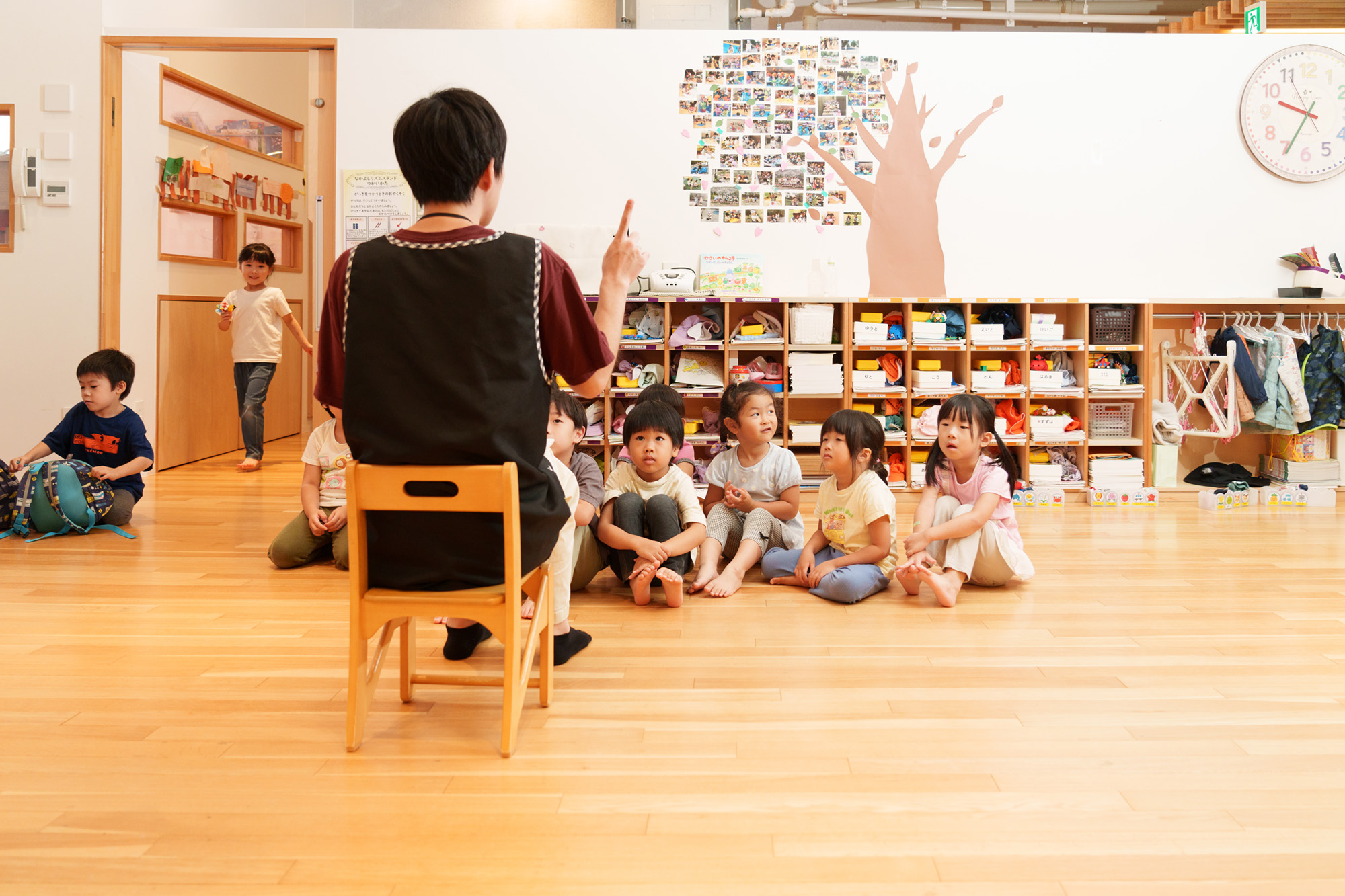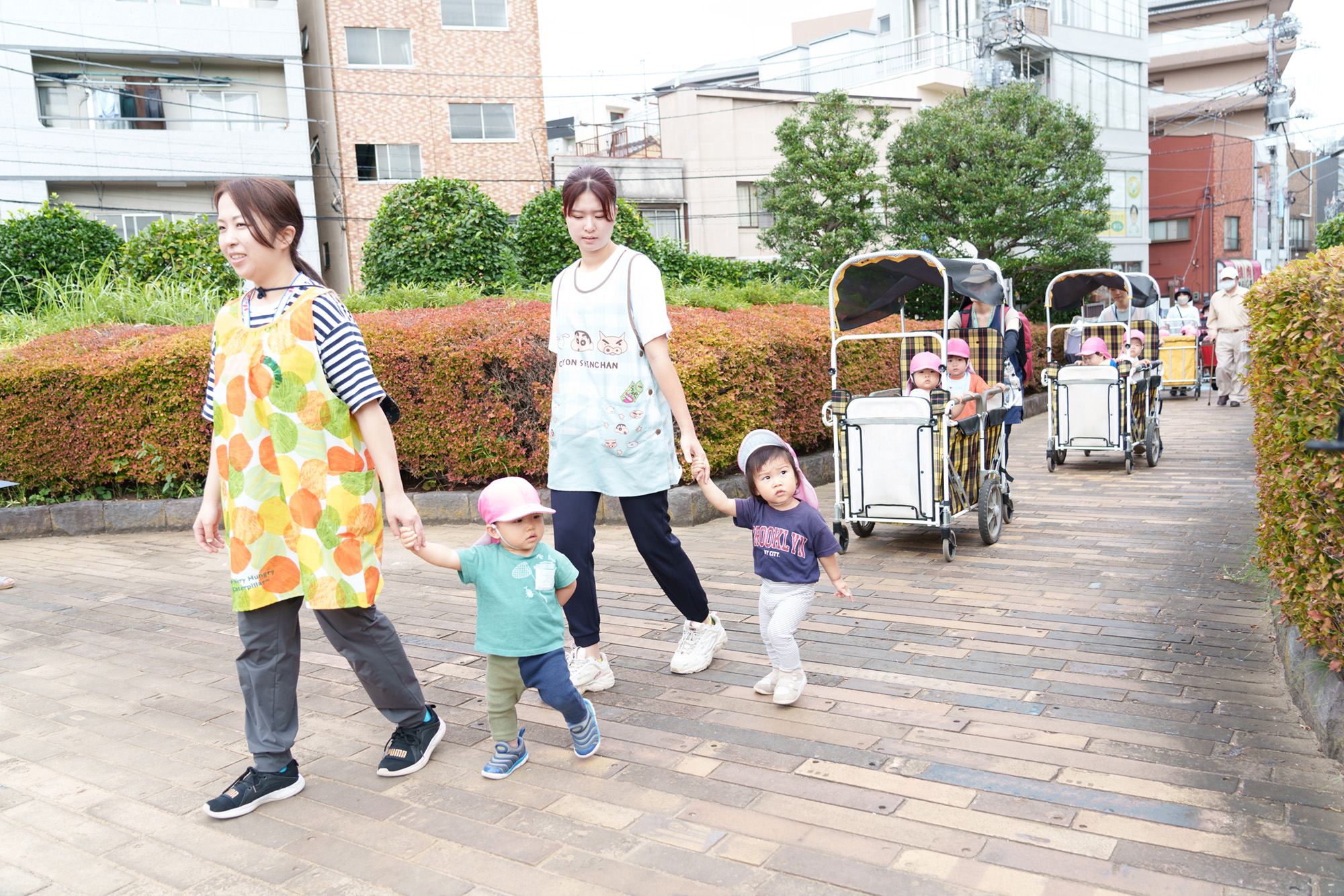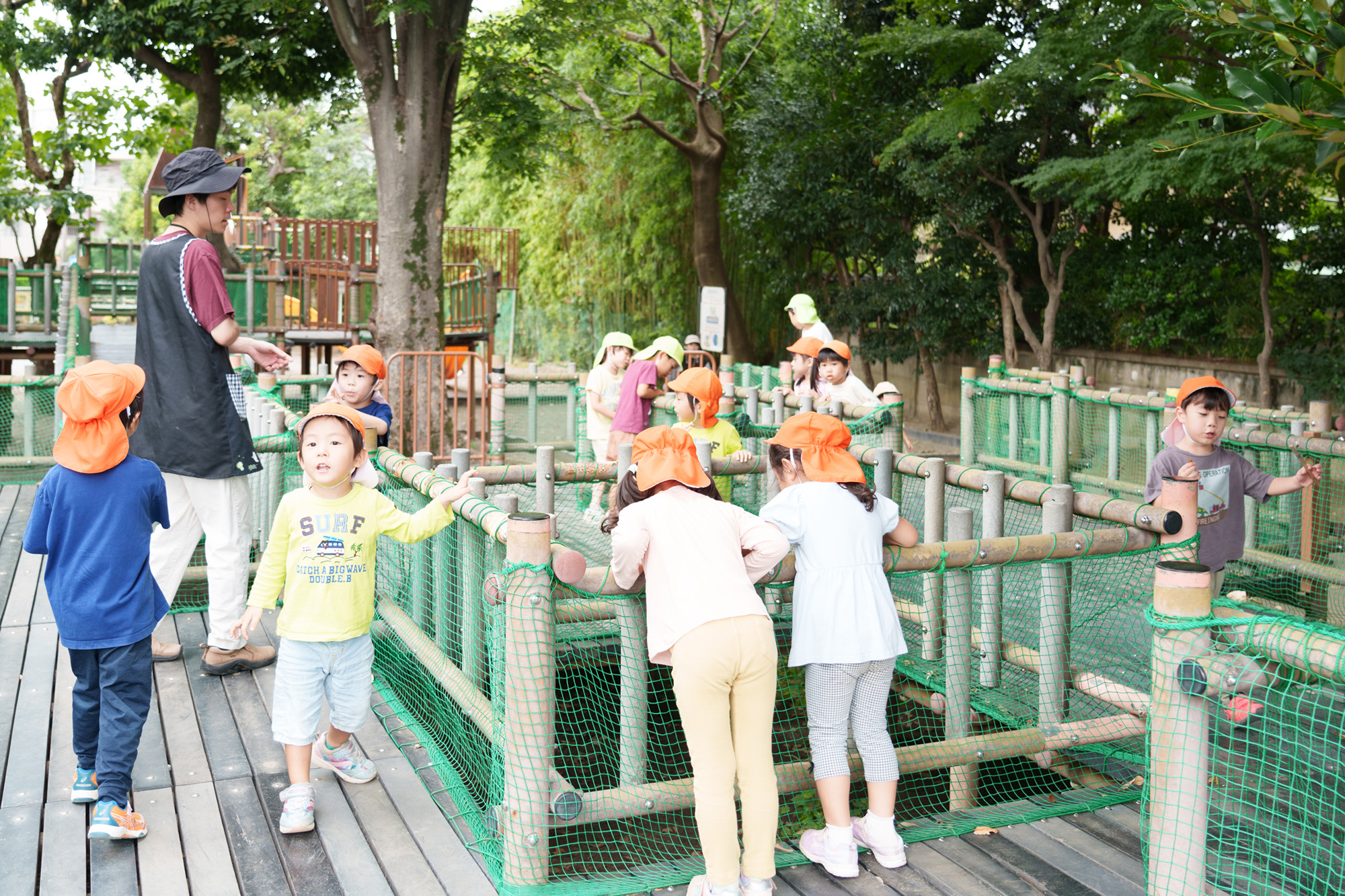 子どもたちの興味関心、成長や発達に合わせた活動を行います。五感を刺激する室内あそびのほか、近隣の公園へのお散歩や園庭などで自然あそびを多く取り入れています。