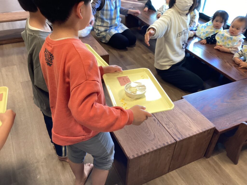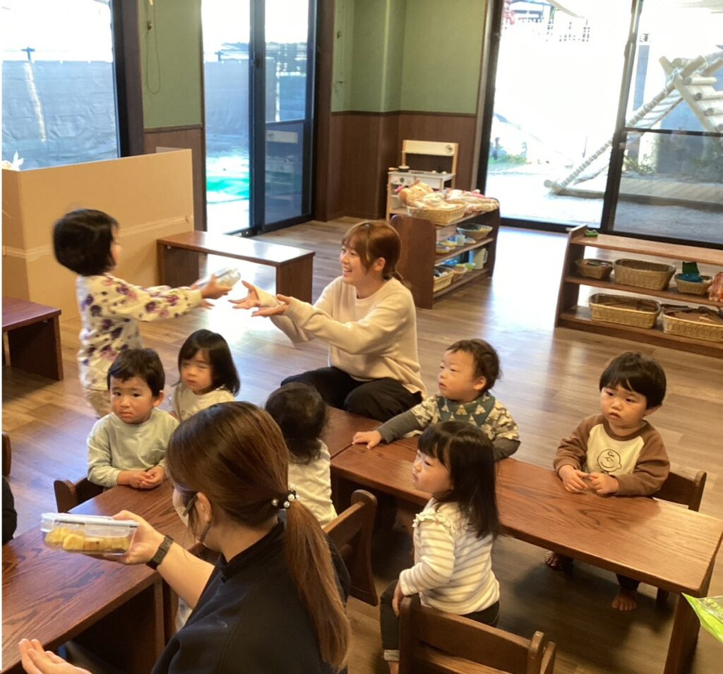 3時のおやつには、0歳児~2歳児へ焼き芋を届けてくれた4歳児・5歳児さん。