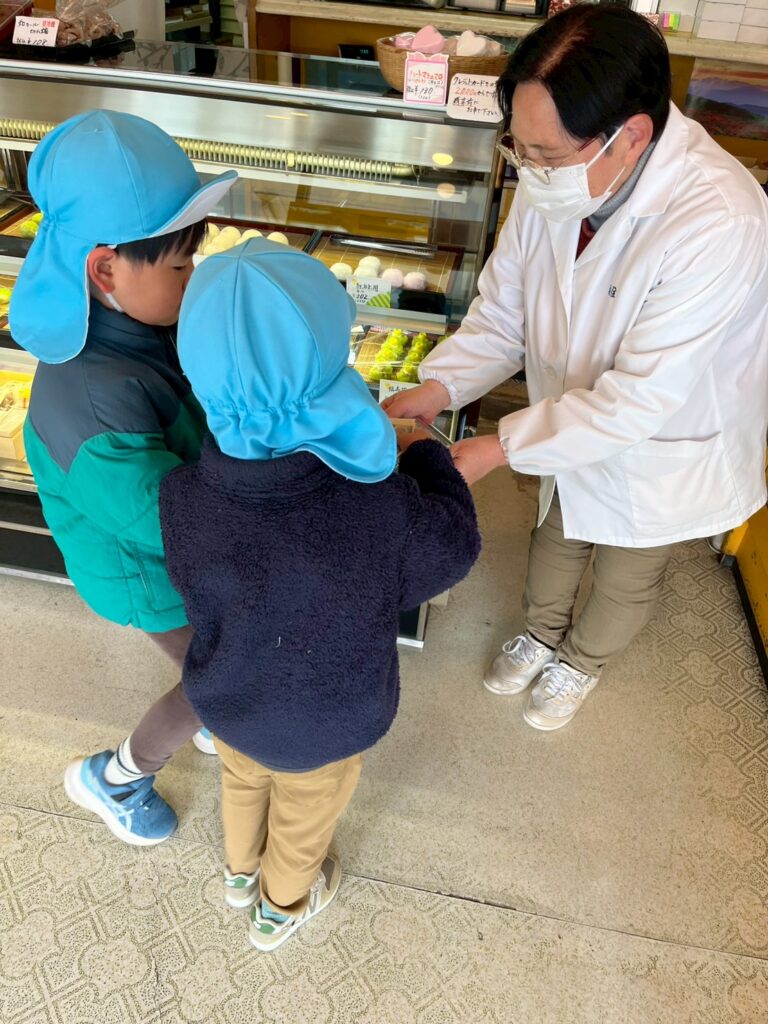 お店の方が、生和菓子を子どもたちの食べやすい大きさにしてくださり、ひとつひとつ大切に持ち帰りました。地域の方との温かなやりとりも含め、子どもたちにとって貴重な経験となりました。