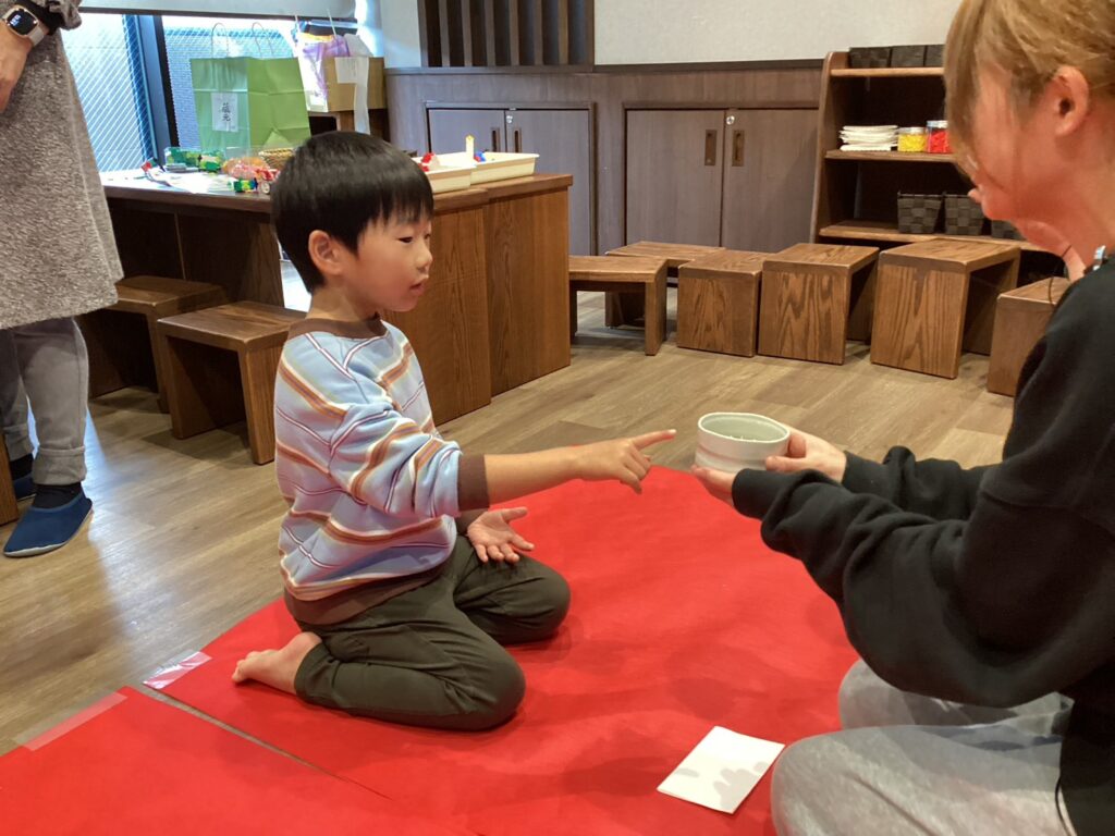 と、相手の目を見て声をかけたり、茶碗の持ち方を教えたりと、お点前の手ほどきまでできるようになった5歳児さん。