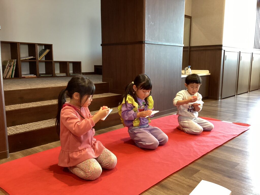 0歳児から4歳児までがお昼寝をしている時間、5歳児さんは“おもてなしをする側”として初釜に参加しました。