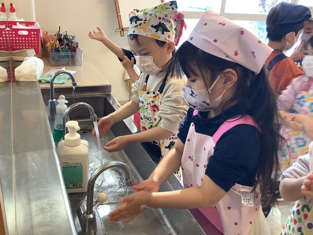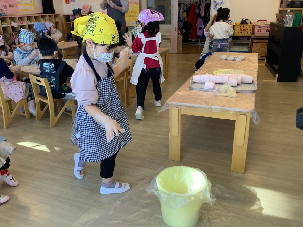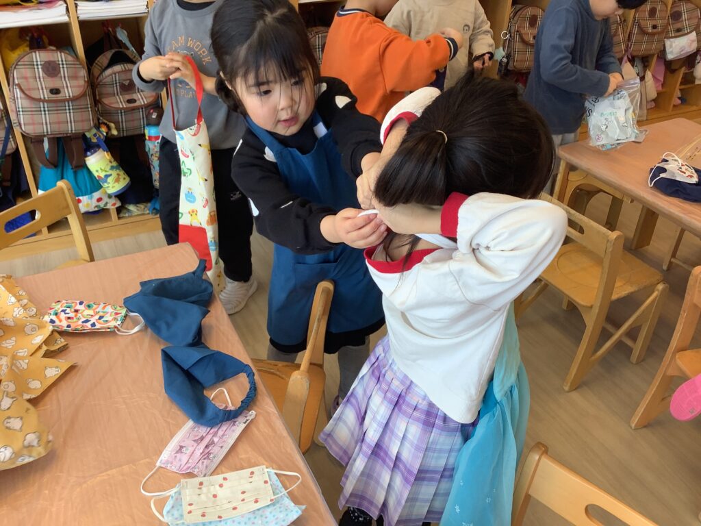 エプロン・三角巾・マスクを着け自分で身支度✨手もしっかり洗います