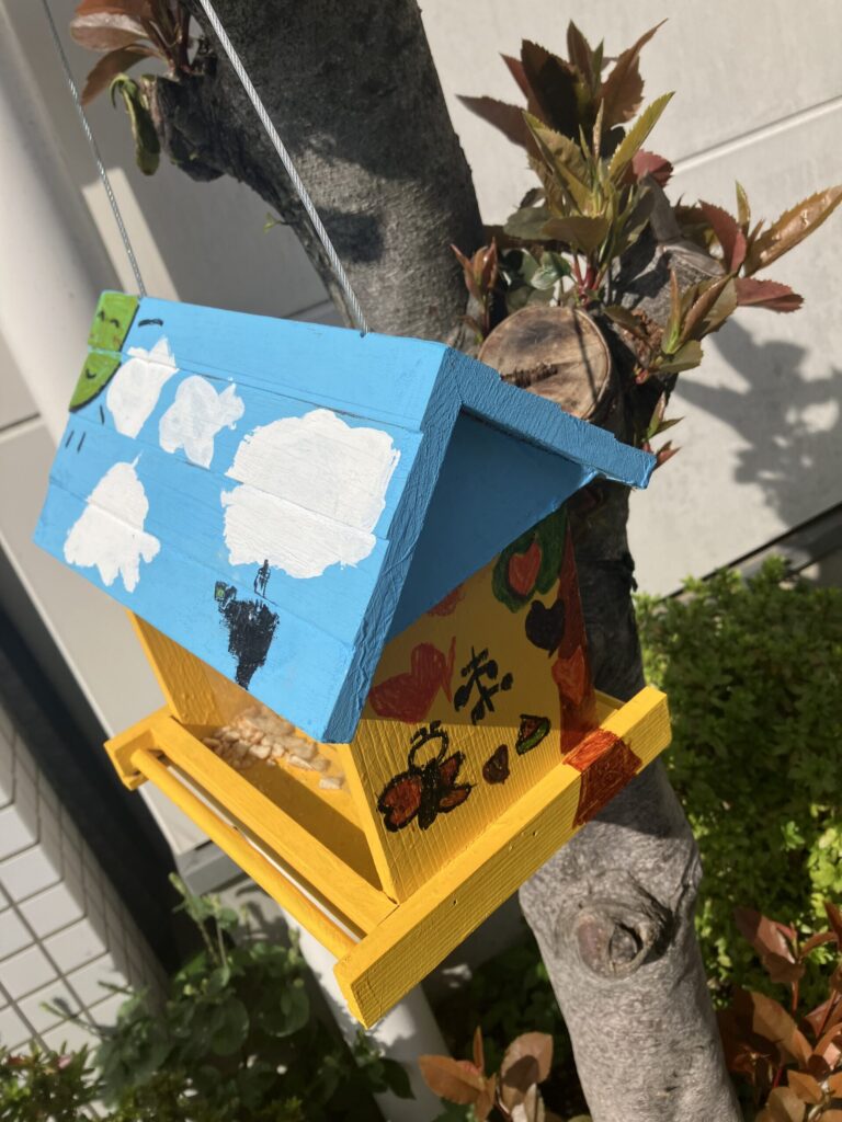お家がリニューアル 2025.10.15 園の様子 園舎の前にある、鳥さんたちのお家。 少し寂しいので、さくら組(5歳児)にお願いをして、リニューアル! とても明るい楽しいお家になりました✨皆さんがご飯を食べに来るのをまっています♪第二所沢おひさま保育園園長 柴 章斗