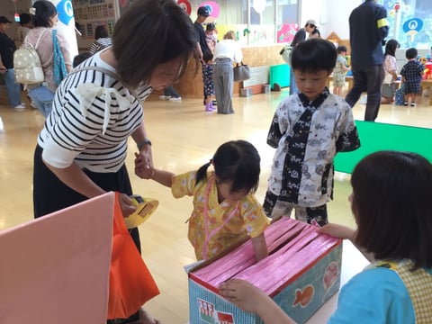 - 夏の夜のひととき、手作りのやぐらを囲んでの盆踊りや夜店をお友だちや保護者の方とともに楽しみます。