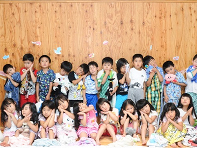 - 5歳児の一大イベント!はじめてのお泊まりにドキドキの子どもたち。一日元気いっぱい遊び、夜はぐっすり眠ります。お泊まりができたことで自信が高まります。