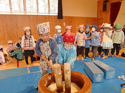 もち米からもちになるまでの様子を観察し、臼と杵を使って自分の手でおもちを作ることを体験します。 お正月ならではのあそびにも触れています。